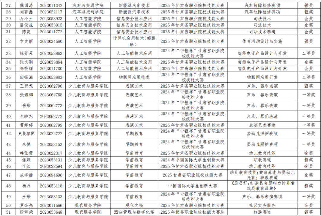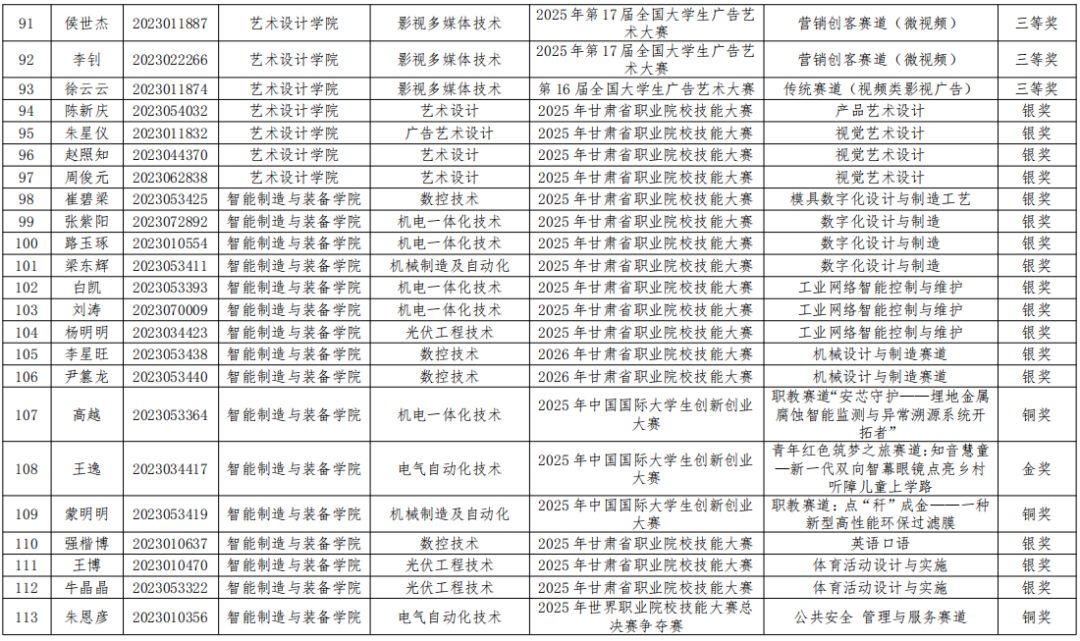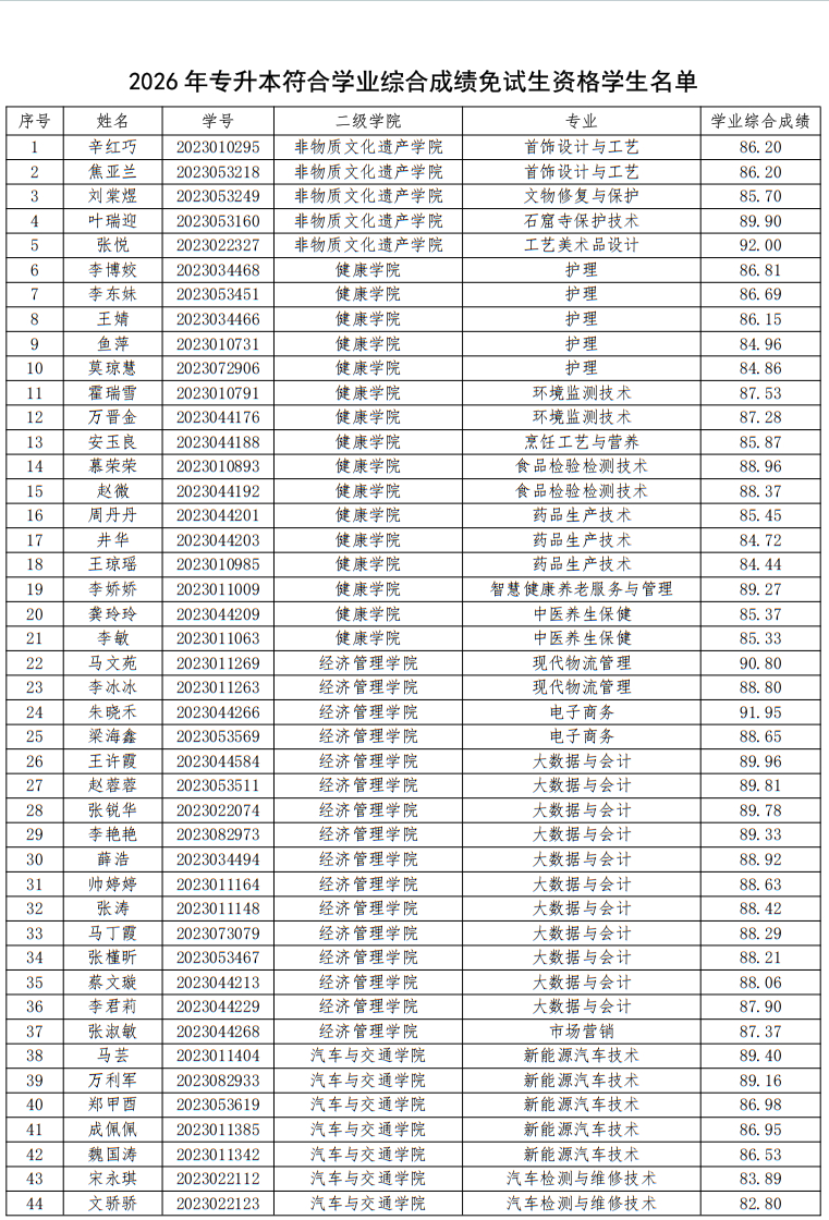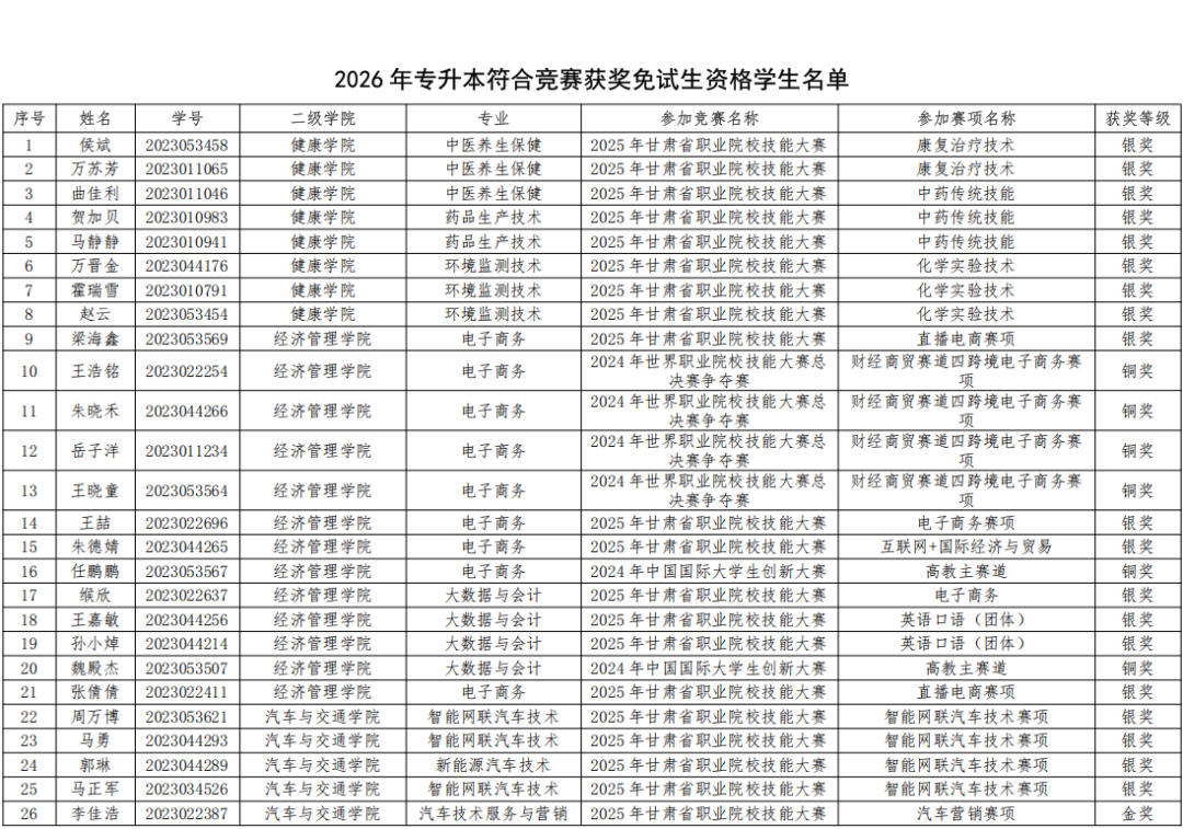 按照甘肃省教育厅《关于印发〈2026年甘肃省普通高等学校高职(专科)升本科考试招生工作方案〉的通知》(甘教学[2025]1号)和甘肃省高等学校招生委员会《关于印发<2026年甘肃省普通高校高职(专科)升本科免试招生工作实施方案〉的通知》(甘招委发[2026]1号)文件要求,兰州职业技术学院2026年高职升本科免试生资格审核工作已完成。根据学生个人申请,各二级学院初审,教务处、招生就业处、学生工作部复审,最终获得免试资格的学生共246人,其中竞赛获奖学生113人,学业综合成绩在本专业排名前3%学生133人(具体名单附后)。