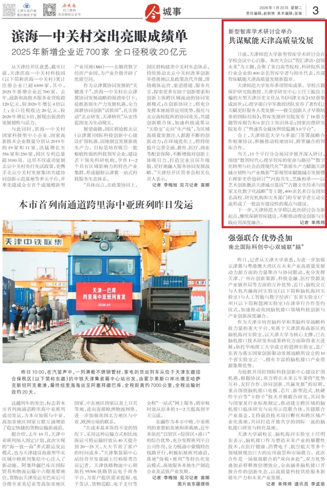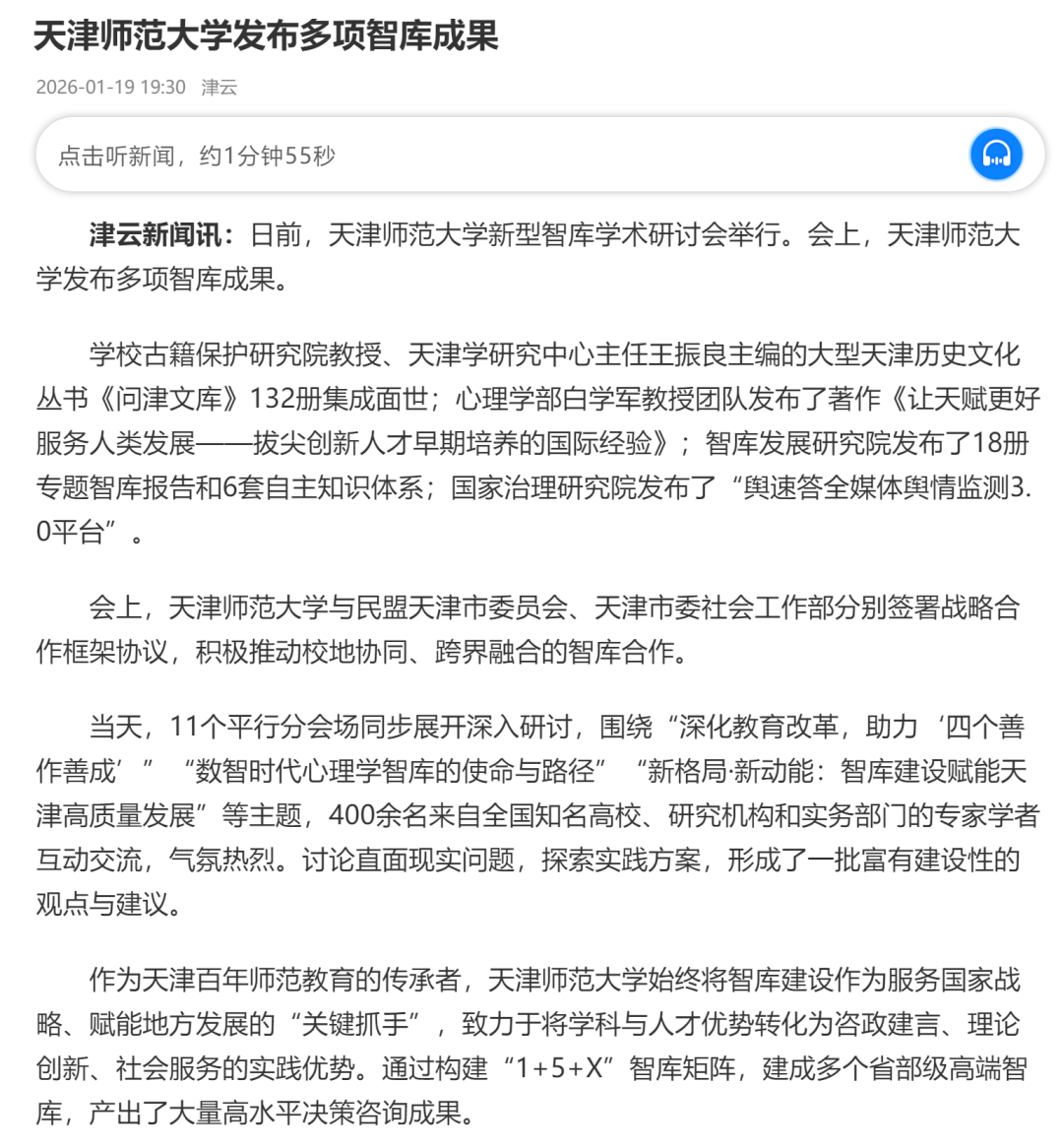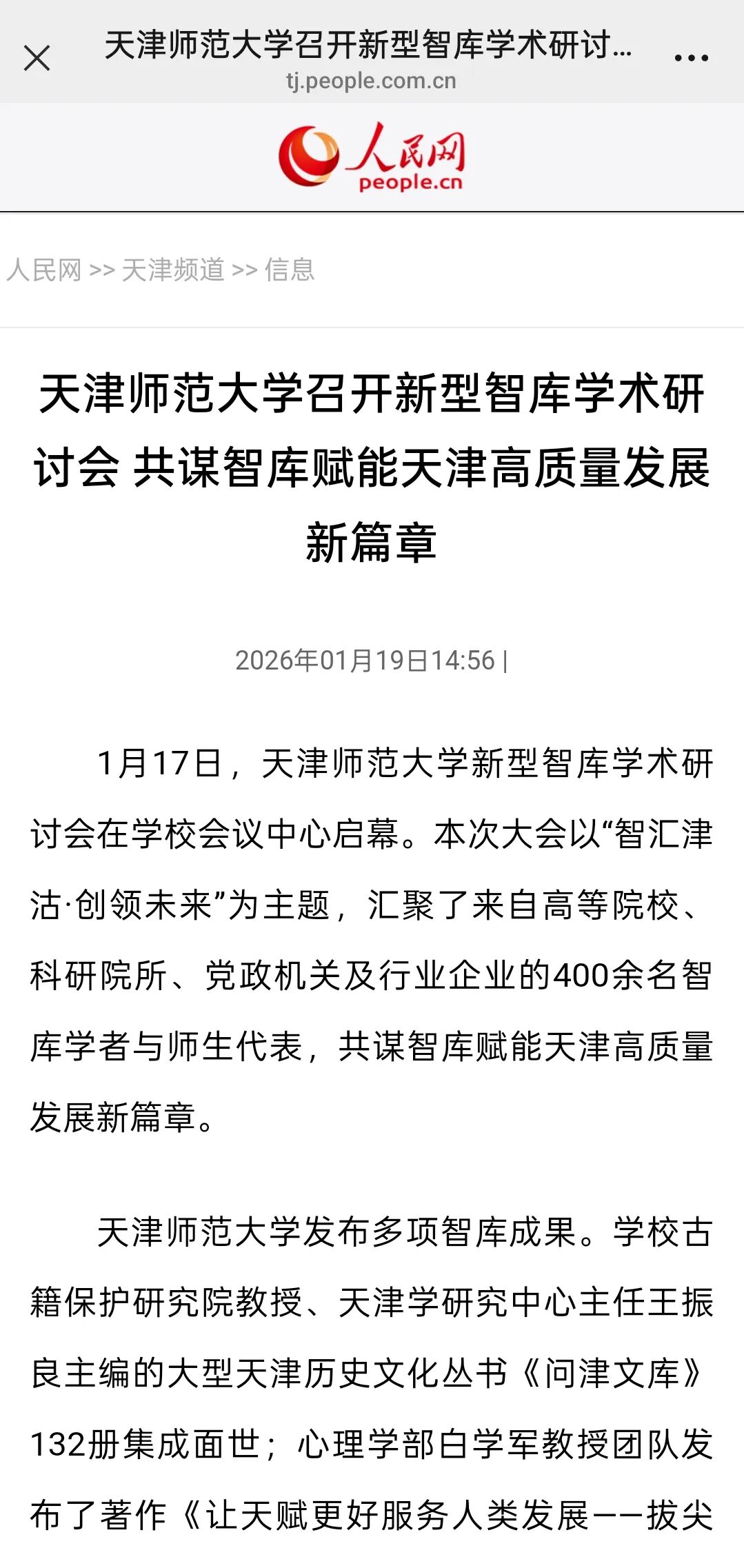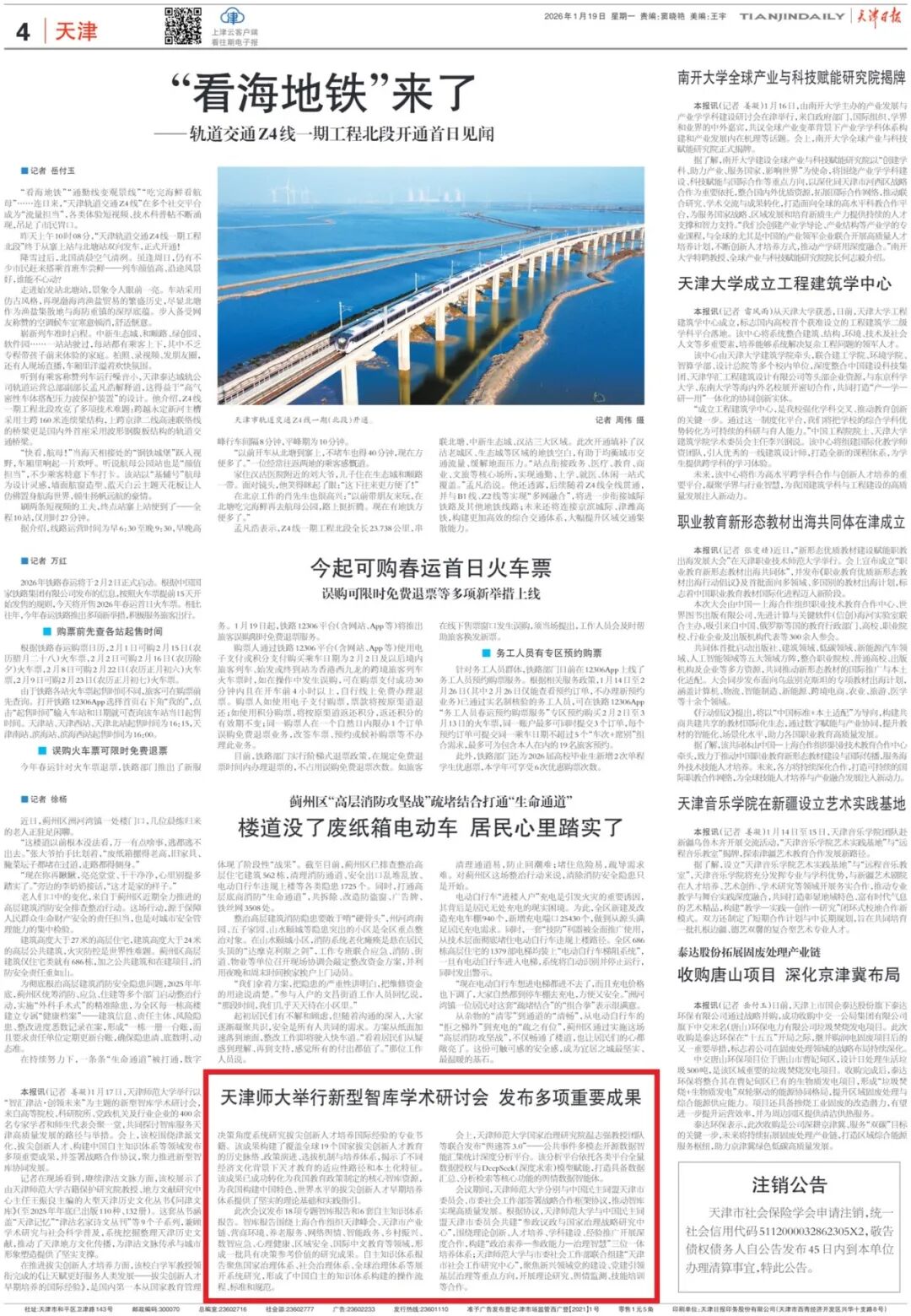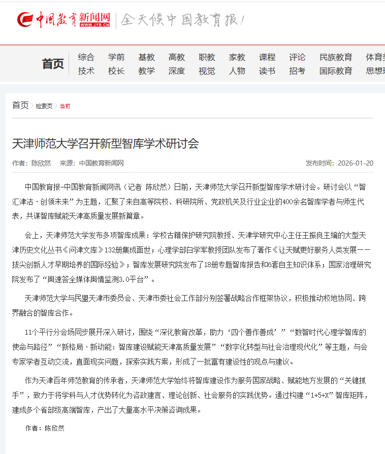 1月17日,天津师范大学“智汇津沽·创领未来”新型智库学术研讨会圆满落幕。研讨会以主旨研讨、成果发布、战略签约等形式,探索智库赋能天津高质量发展路径,400余名来自全国各高校、科研院所、党政机关及企业的智库学者与师生代表齐聚一堂,以思想碰撞凝聚共识、以务实举措谋划发展。新华社、人民网、光明日报客户端、中国社会科学报、中国日报网、中国教育新闻网、天津日报、今晚报、天津教育报、津云等媒体同步聚焦,全景呈现这场思想盛宴,生动展现了学校以智库建设赋能区域经济发展建设的创新成果。