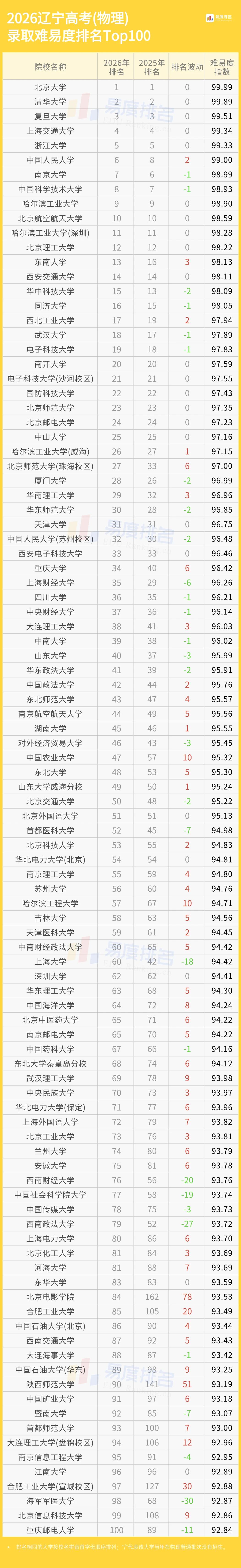 昨天易度为大家分析了辽宁省2026最新提前批新政策及填报指南,今天为大家揭晓“2026年辽宁高考录取难易度排名Top100(物理类)”
