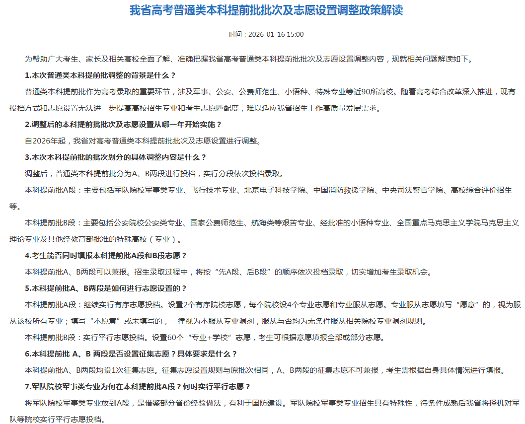 2026年起,辽宁普通类本科提前批正式调整为A、B两段。