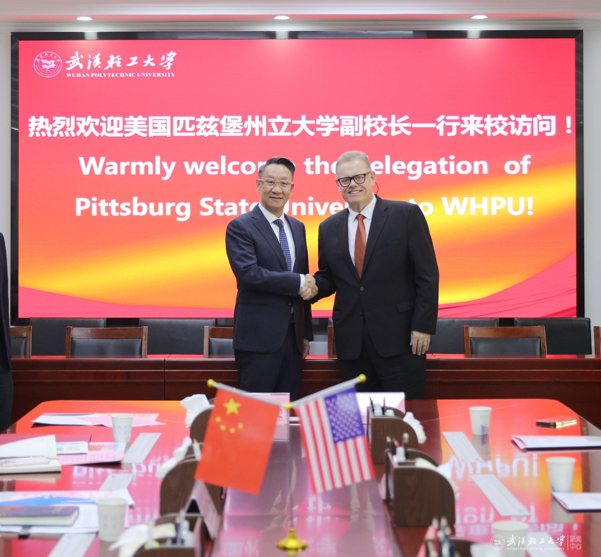 本网讯2026年1月13日至14日,美国匹兹堡州立大学副校长卡尔·斯图默(Mr.Karl Stumo)、国际合作部主任艾伦·赫特(Mr.Aaron Hurt)一行访问我校。校党委书记严冀钢亲切会见代表团一行并举行座谈交流,副校长王宏勋、丁华锋参加相关交流活动。