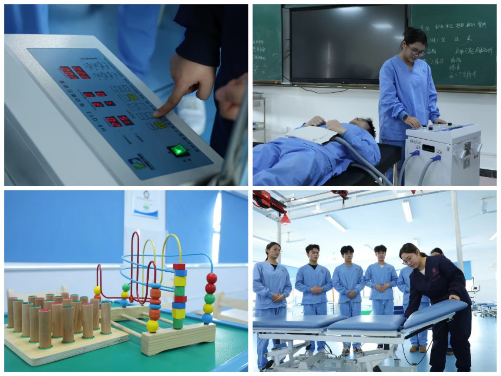 运动治疗实训室、作业治疗实训室、物理因子治疗实训室、言语治疗实训室、康复工程实训室、康复评定实训室