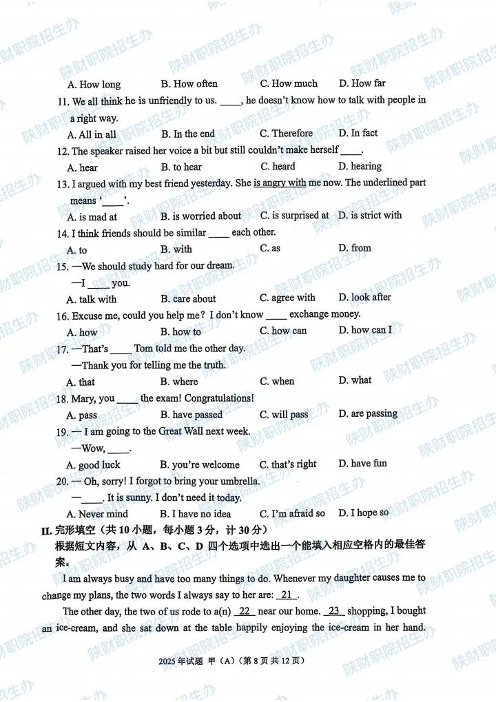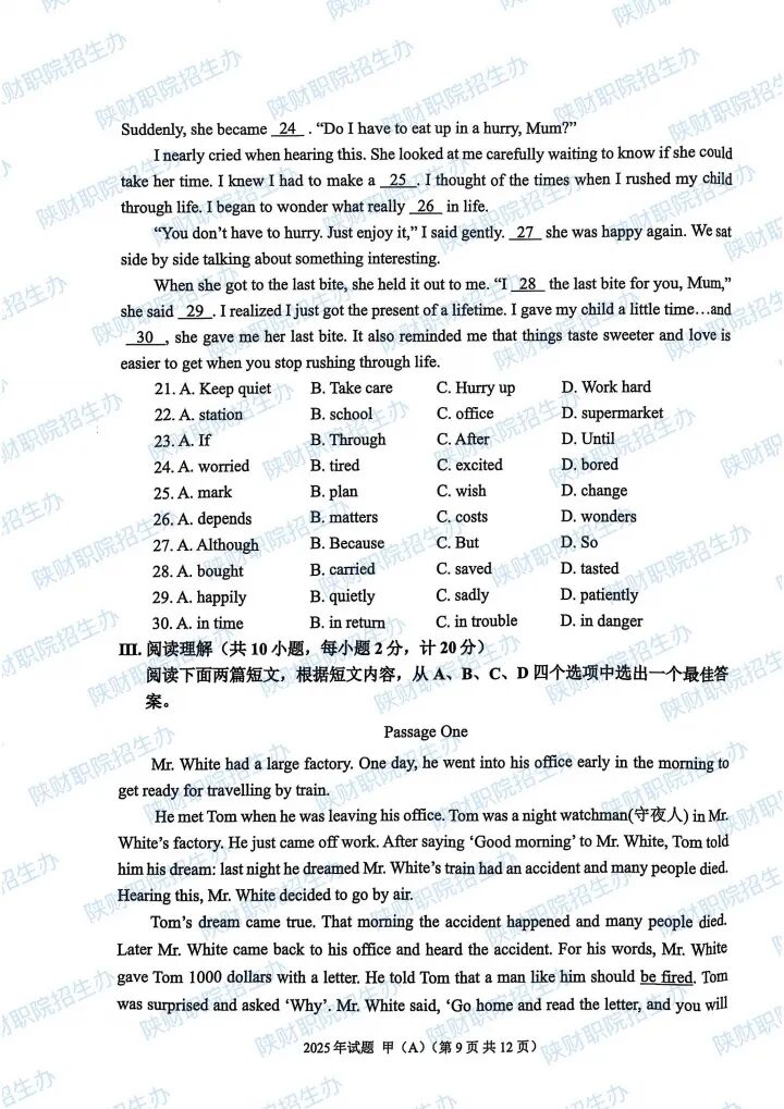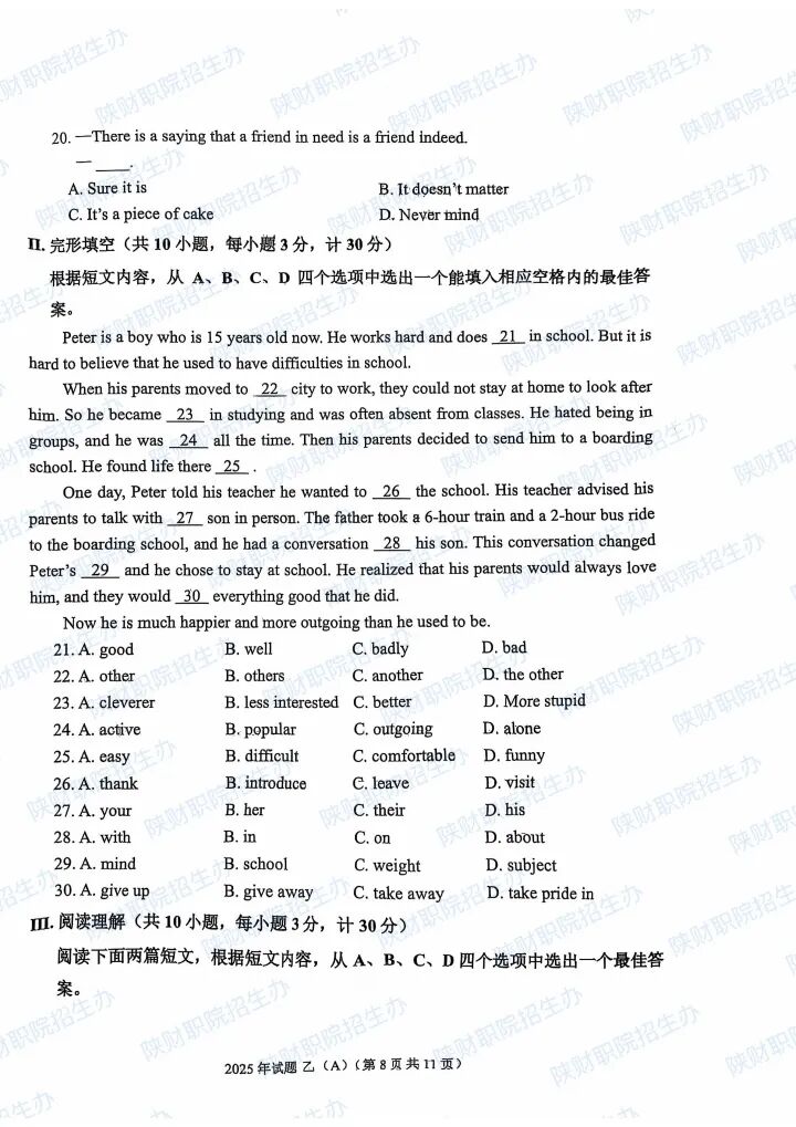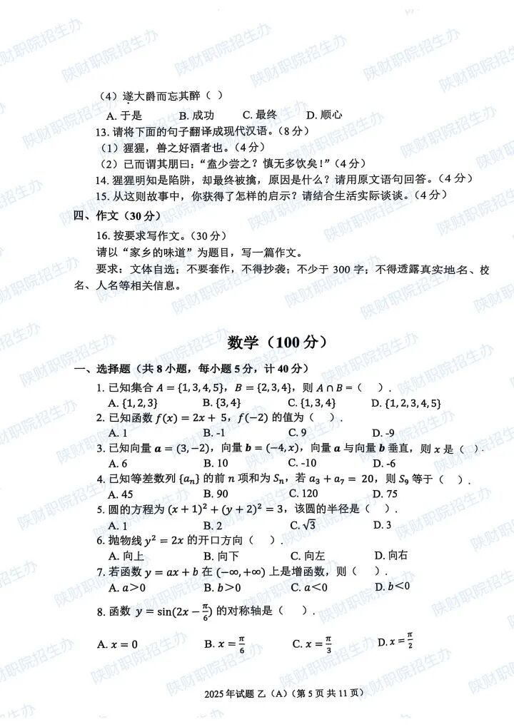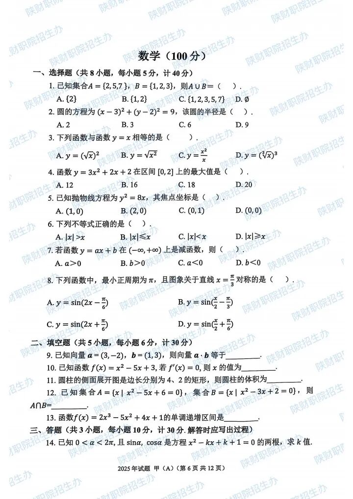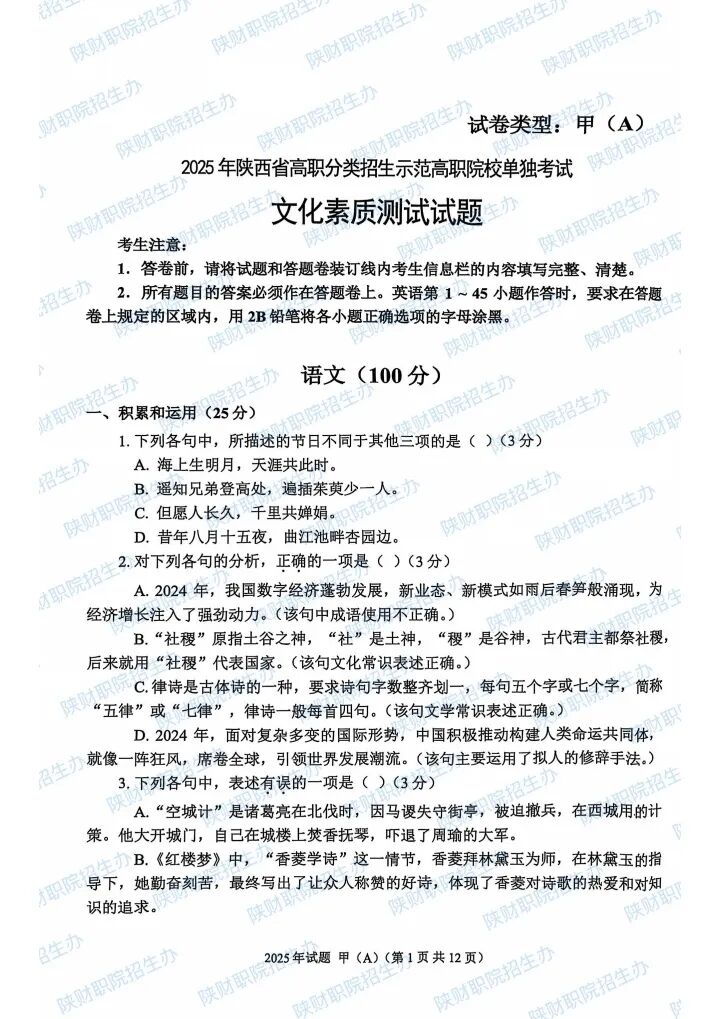 2025年陕西省高职分类招生示范高职院校单独考试试题甲卷-普高生.pdf2025年陕西省部分高等职业院校自主招生考试乙卷-三校生.pdf2024年陕西省高职分类招生示范高职院校单独考试试题甲卷-普高生.pdf2024年陕西省高职分类招生示范高职院校单独考试试题乙卷-三校生.pdf2023年陕西省部分高等职业院校自主招生考试甲卷-普高生.pdf2023年陕西省部分高等职业院校自主招生考试乙卷-三校生.pdf2022 年陕西省部分高等职业院校自主招生考试 甲卷-普高生.pdf2022 年陕西省部分高等职业院校自主招生考试 乙卷-三校生.pdf2021年陕西省部分高等职业院校自主招生考试甲卷-普高生.pdf2021年陕西省部分高等职业院校自主招生考试乙卷-三校生.pdf