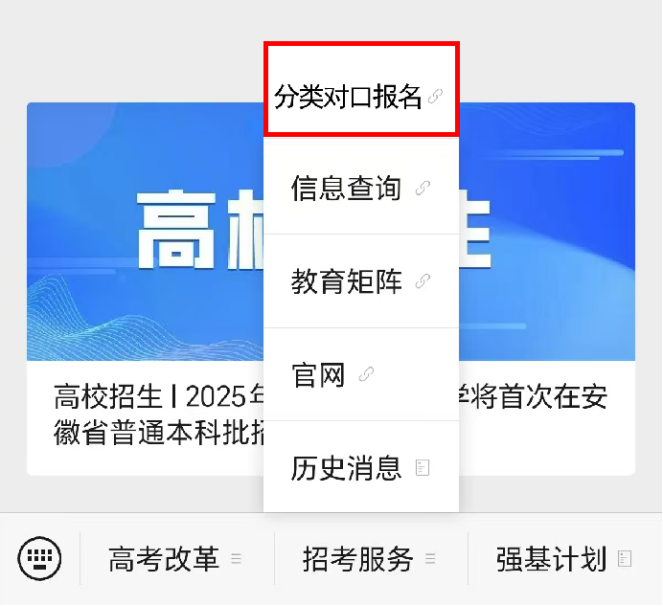 1. 用浏览器访问gkbm.ahzsks.cn或通过安徽省教育招生考试院微信公众号访问(进入微信公众号,选择“招考服务”-“分类对口报名”)。