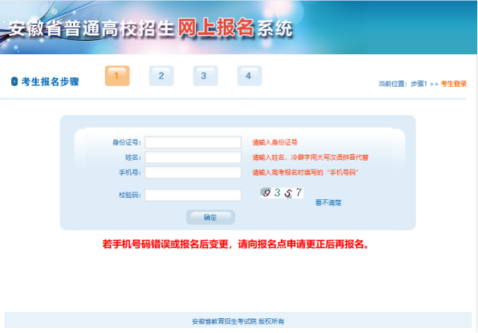 4. 登录系统报名需要填写高考报名时填报的“手机号码”,若遗忘,可以到报名点、当地招生考试机构查询。如手机号码错误或报名后变更,请向报名点申请更正后再报名。