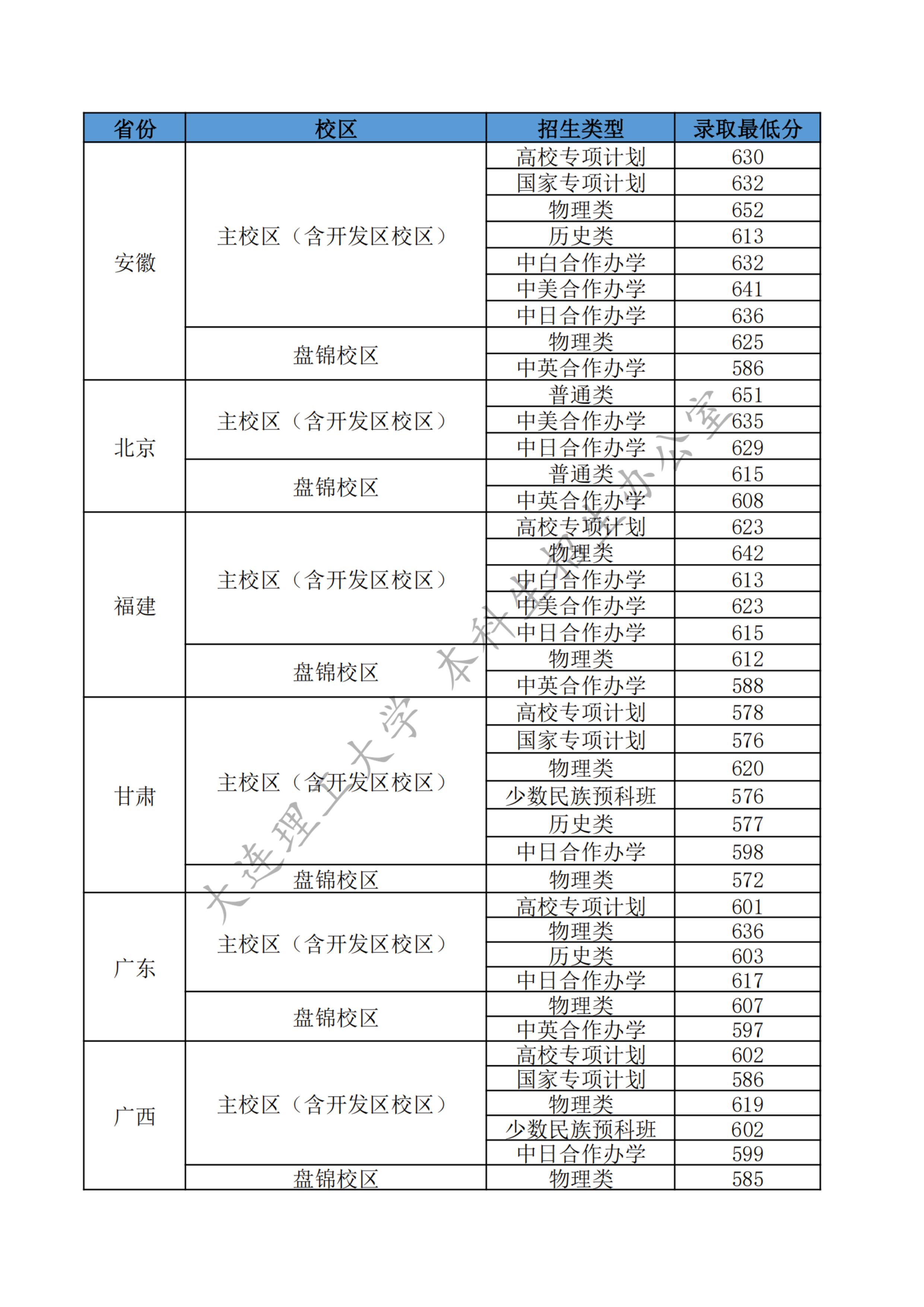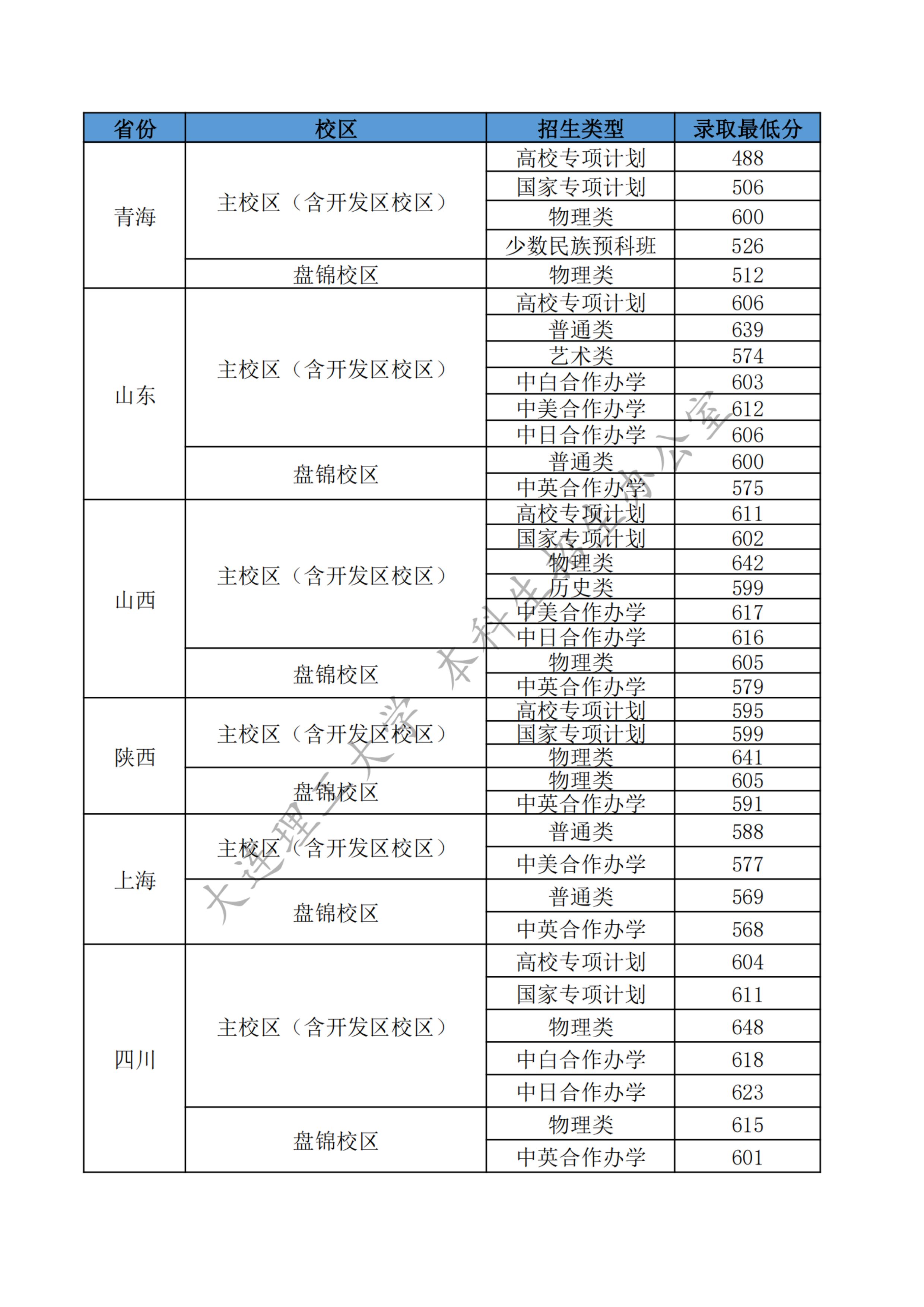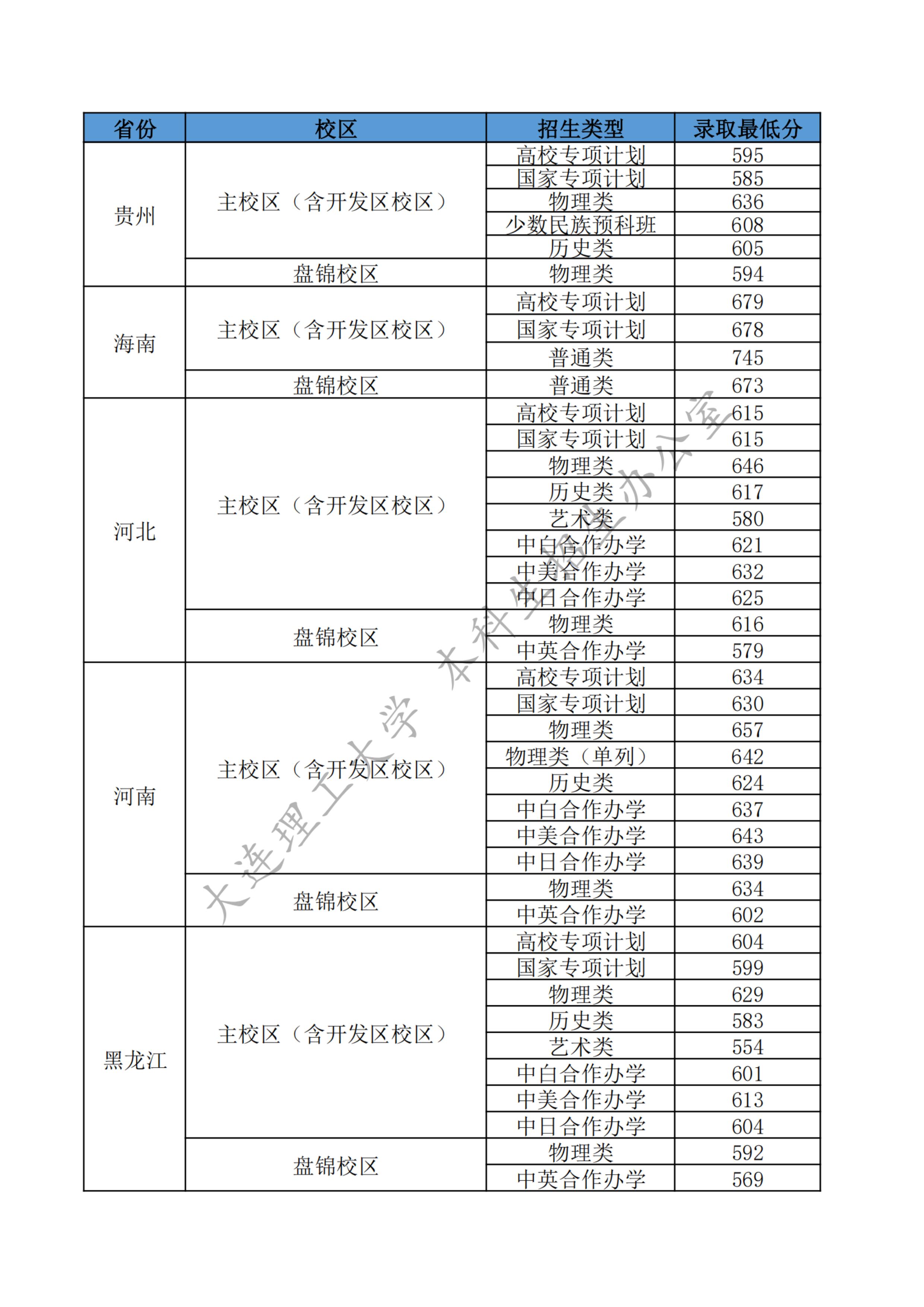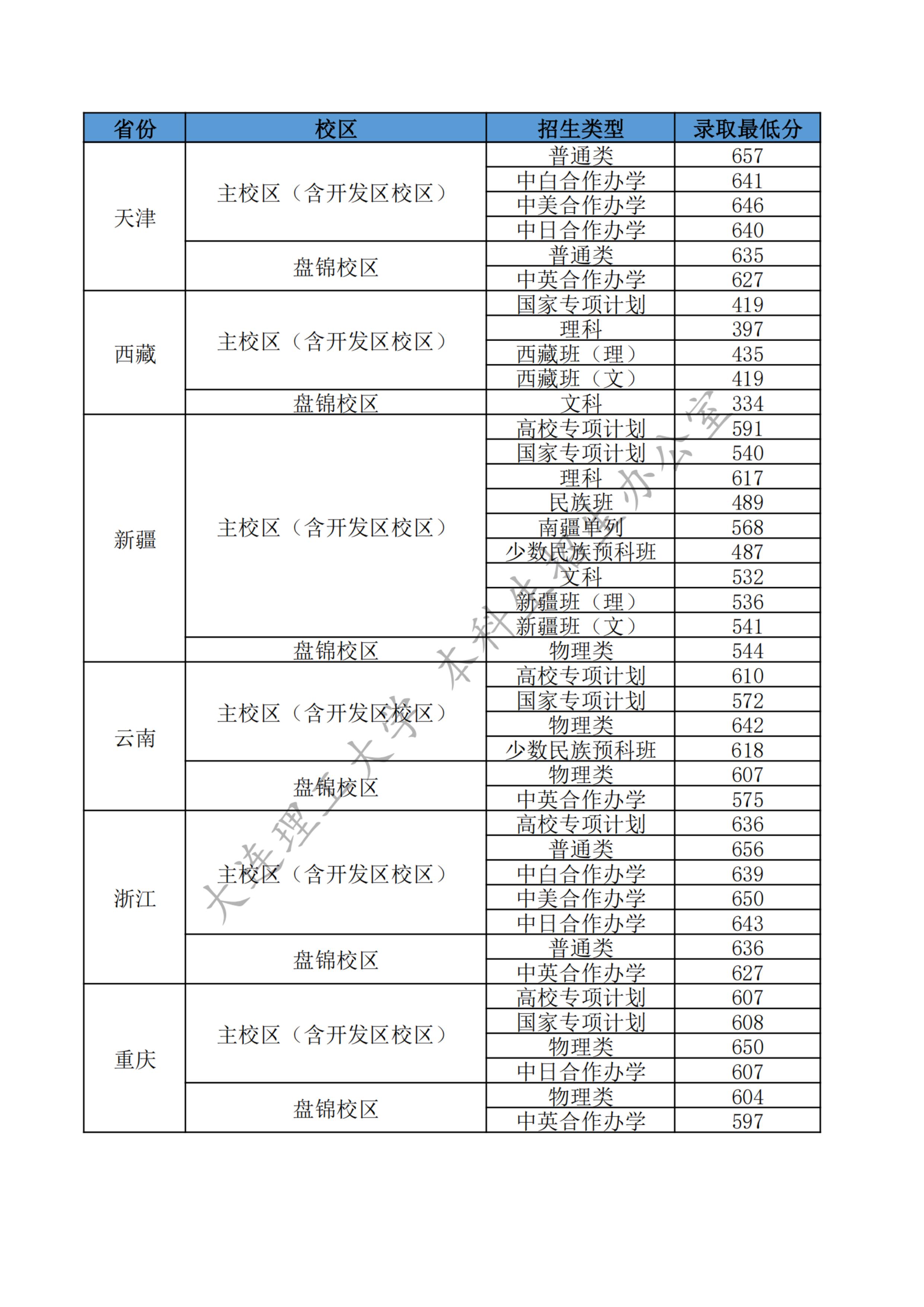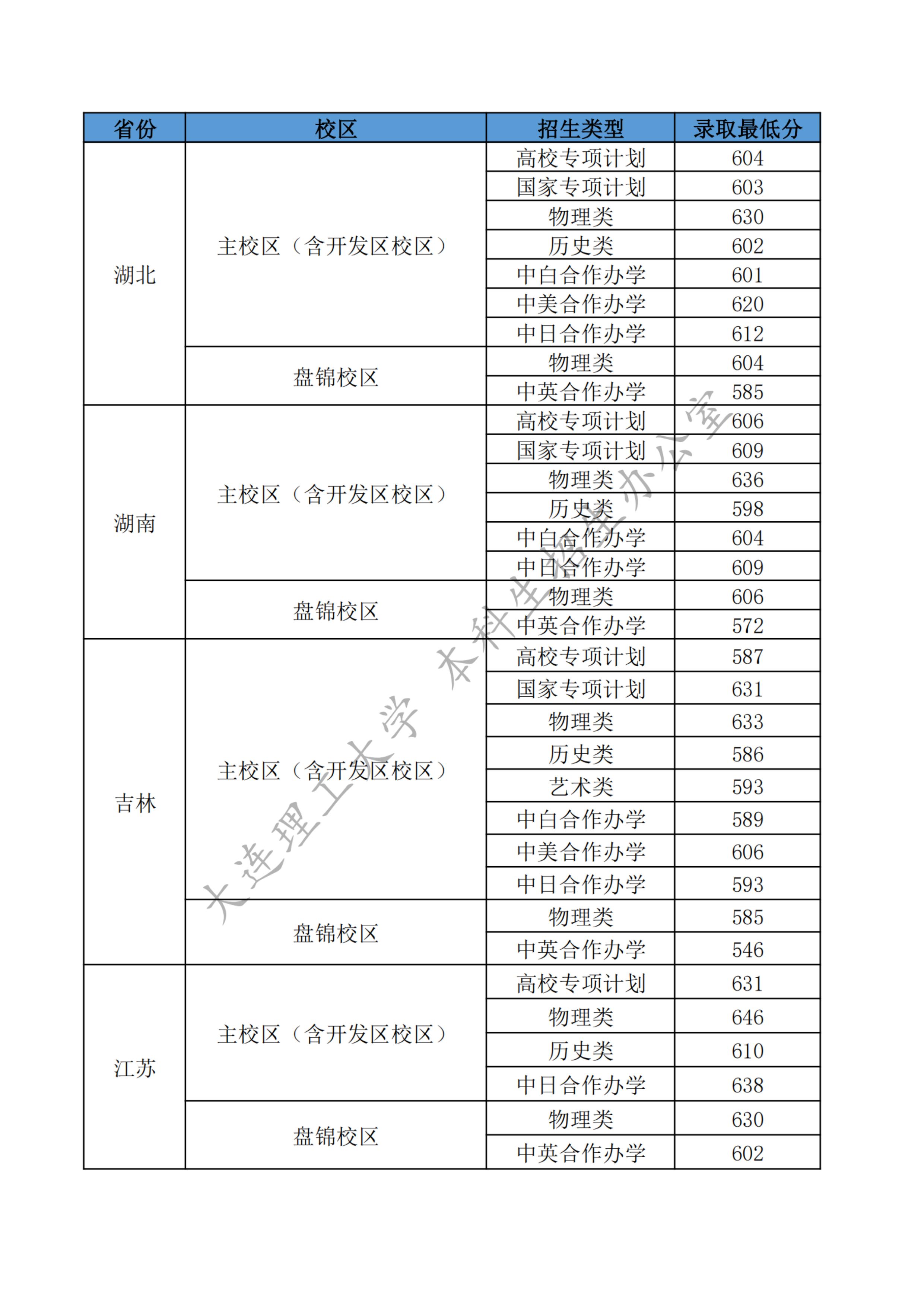 大连理工大学2025年各省各类型招生录取最低分