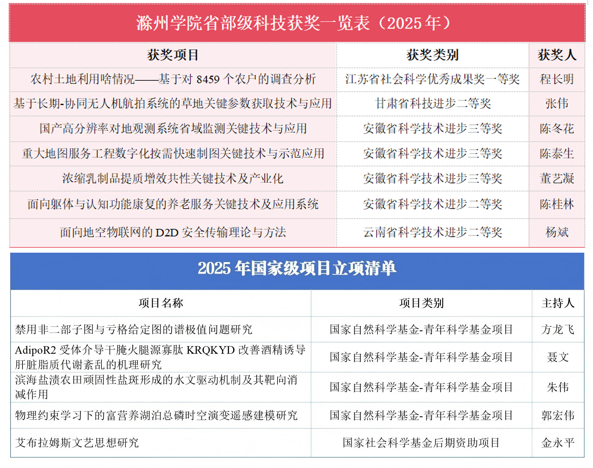 2025年10月,2024年度安徽省科学技术奖专业(学科)评审结果公示,滁州学院获奖数量位居全省同类高校前列今年学校共获批省级科技(社科)奖项7项,其中以第一完成单位获批安徽省科技进步二等奖1项、三等奖2项,以参与单位获批省级社科奖一等奖1项、科技进步二等奖2项、三等奖1项,数量创建校以来新高。同时,获批4项国家自然科学基金项目、1项国家社科基金后期资助项目,师生在《Advanced Science》《Food Chemistry》《Angewandte Chemie International Edition》《Ecological Indicators》等国际知名期刊发表高水平研究论文6篇,1名教师进入2025 Stanford/Elsevier Top 2% Scientists List相关榜单,学校科研实力持续增强。