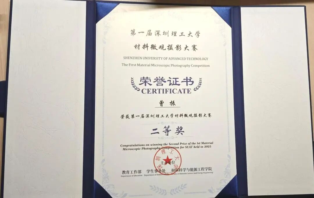 如今,他不仅是2024-2025学年度国家励志奖学金获得者,更凭借作品《星河留恋》摘取深圳理工大学材料微观摄影大赛二等奖,在科研与竞赛的道路上稳步前行。