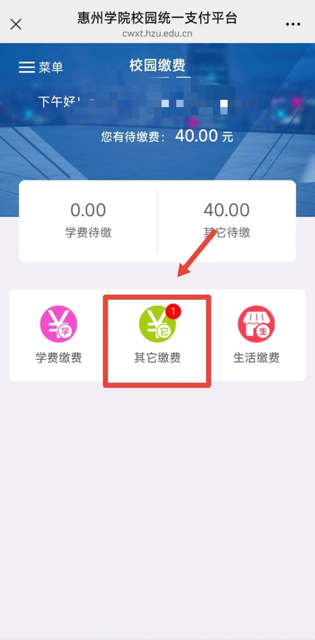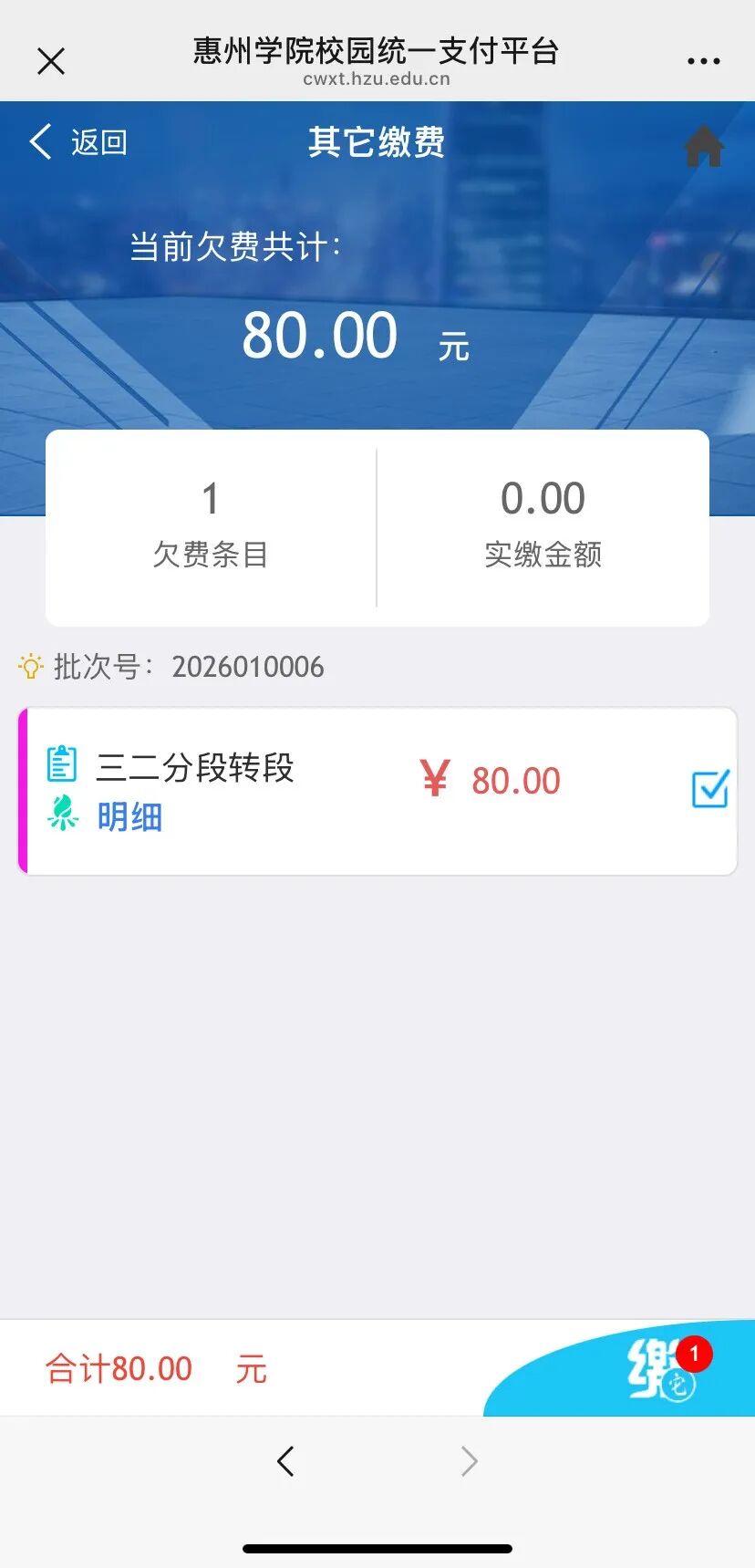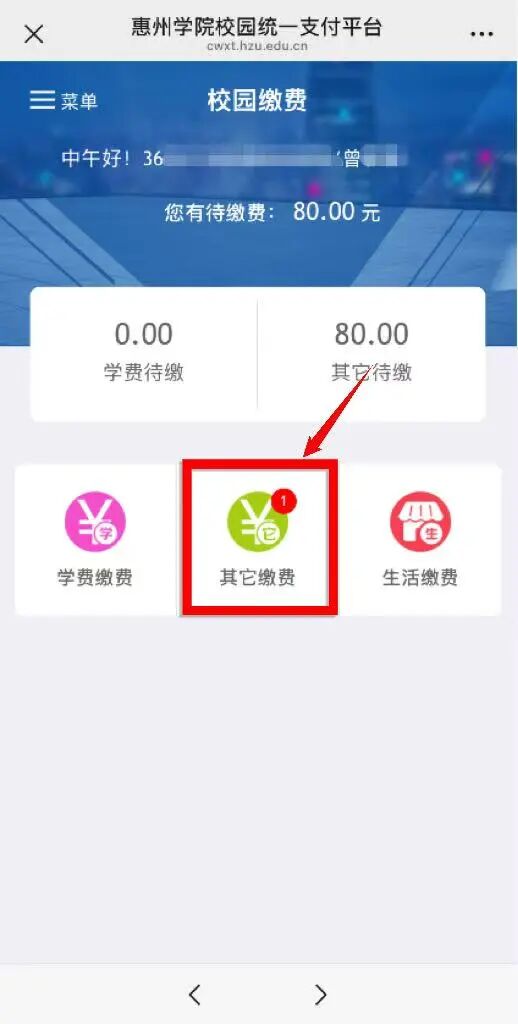 步骤二:登录后点击“其它缴费”,选择“专升本校考科目”或“三二分段转段”的收费项目,确认项目及金额无误后点击右下角的“缴费”。