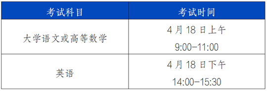 考试科目分省考试院组织的公共课和招生院校组织的专业课两部分。实行“2门公共课(各150分)+2门专业课(各150分)”的考试方式,即公共课考试科目分文、理两个科类,其中,文科2门公共课为“大学语文+