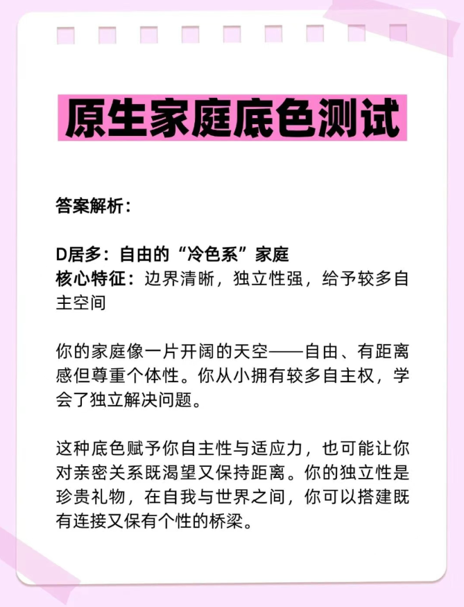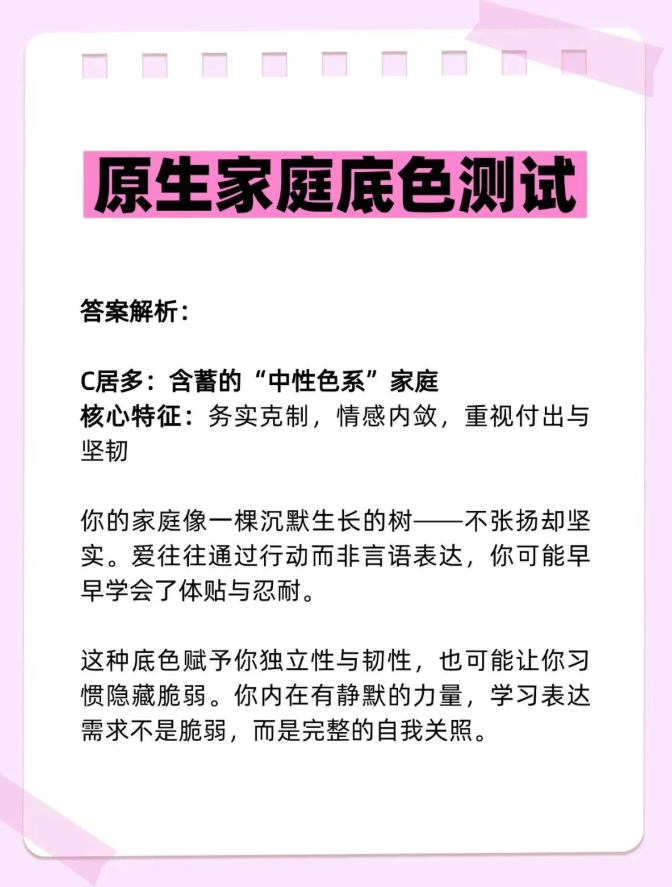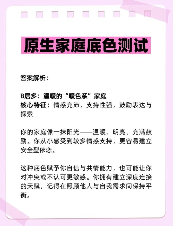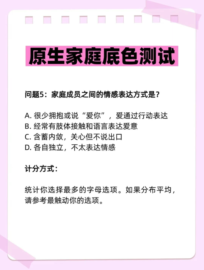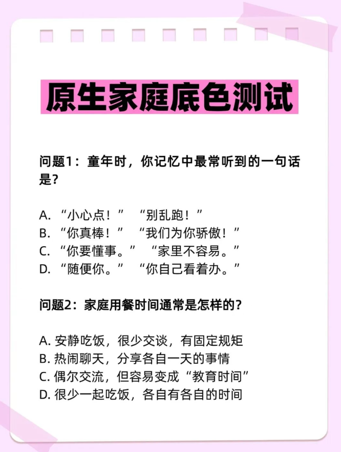 请凭第一直觉回答以下5个问题,每个问题选择一个最符合你成长经历的选项。测试结果将揭示你原生家庭的情感氛围与互动模式。