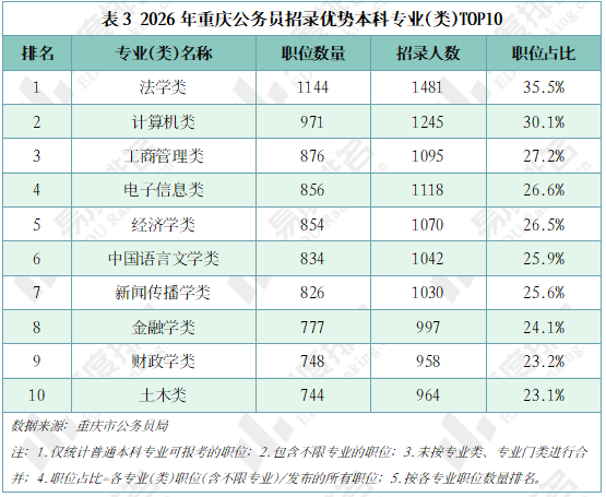重庆市2026年公务员招录岗位对本科生的专业要求统计显示,574个岗位未设置专业限制。法学类本科生叠加不限专业岗位后,其可报考岗位占比达35.5%,居各专业(类)之首。计算机类紧随其后,占比超过30%。从前十类专业来看,经管、政法及文学相关专业在公务员招录中仍保持优势地位。