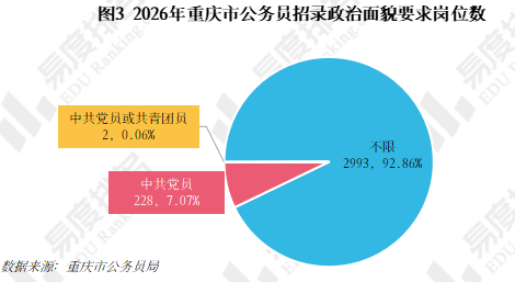 下图展示了2026年重庆市公务员招录岗位对政治面貌的要求情况。其中对政治面貌无要求的岗位占比为92.86%;要求中共党员的岗位占比为7.07%。