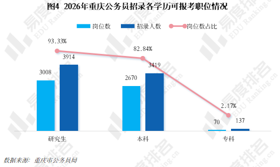 2026年重庆公务员招录职位学历要求中,专科学历能够报考的职位仅70个,占所有职位的2.17%;本科学历可报考的职位达到2670个,占所有职位的82.84%。与之相比研究生学历考公选择更多,可报考93.33%的职位。