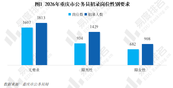 总体来看,近50%的岗位对性别无要求。其余对性别有要求的岗位中,934个岗位限男性报考,682个岗位限女性报考。