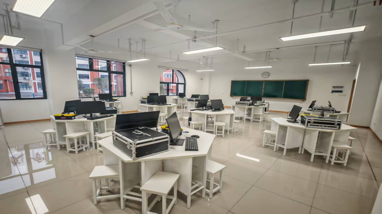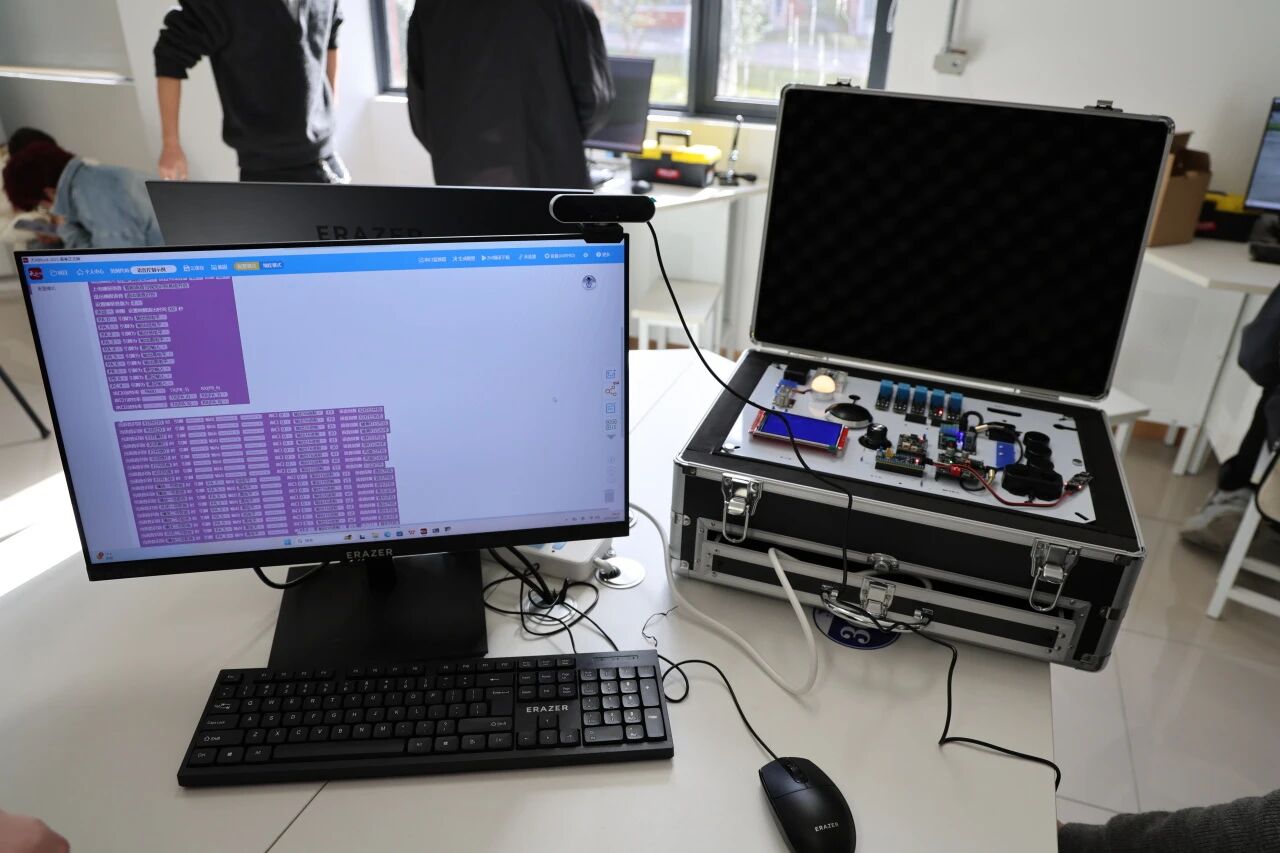 三间实训室投入使用,一间智能感知与控制实训室,配备有AI智能物联网实验工具箱、电工电子实训工具箱;一间3d仿真与AI编程实训室;一间空天地智联网实训室,配备有北斗导航实训仪、松雅湖实验仿真模型、星空一体化模型