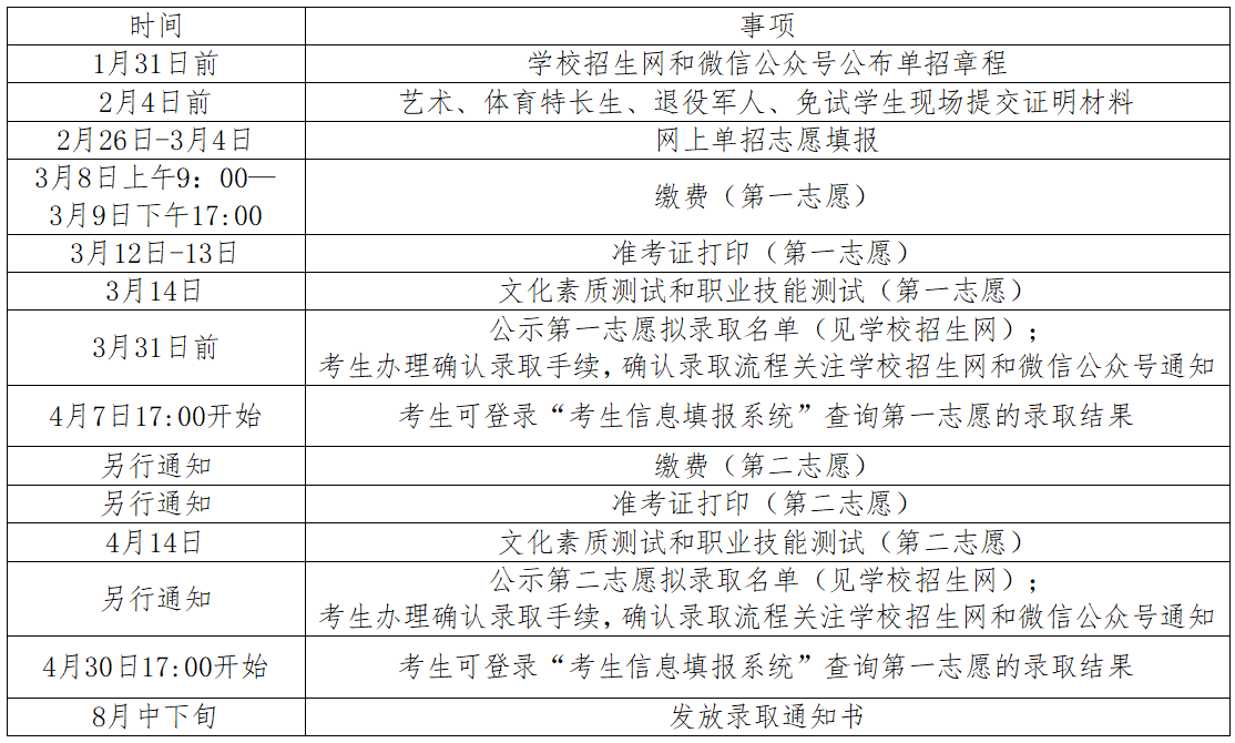 2.准考证打印:缴费成功的考生于2026年3月12日—13日自行下载打印准考证,缴费及准考证打印流程详见学校招生网和微信公众号。第二志愿缴费时间等将另行公布。