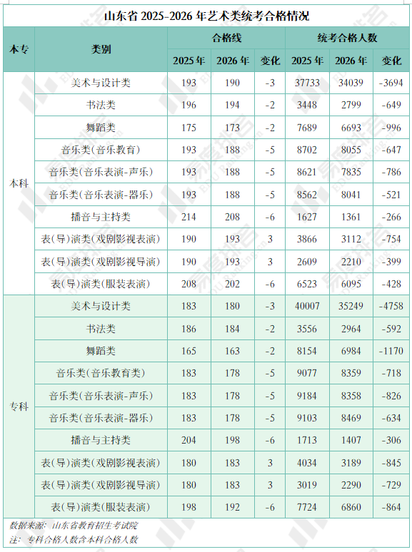 山东省2026年艺术统考各类别合格线较上年发生变化。