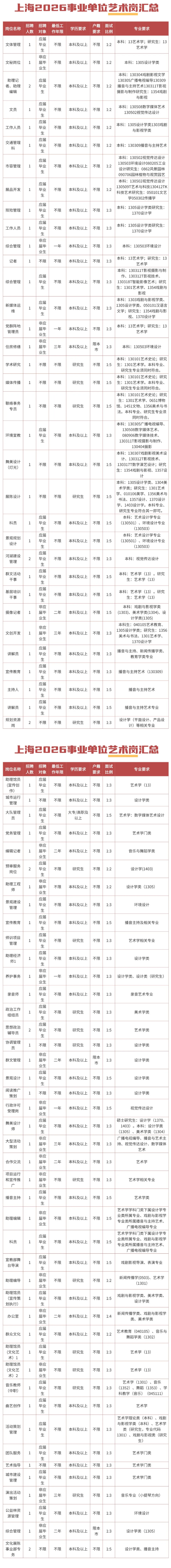 本次艺术类岗位主要集中在区级文化馆、融媒体中心、文旅局及市级文化单位,如静安区文化和旅游局、崇明区融媒体中心等均设置相关岗位。岗位类型分为两类:专业技术岗:涵盖舞美设计、