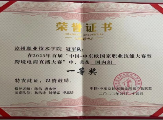 学生近年荣获:- “一带一路”暨金砖国家技能发展与技术创新大赛之跨境电子商务进出口经营模拟赛项全国总决赛一等奖两次