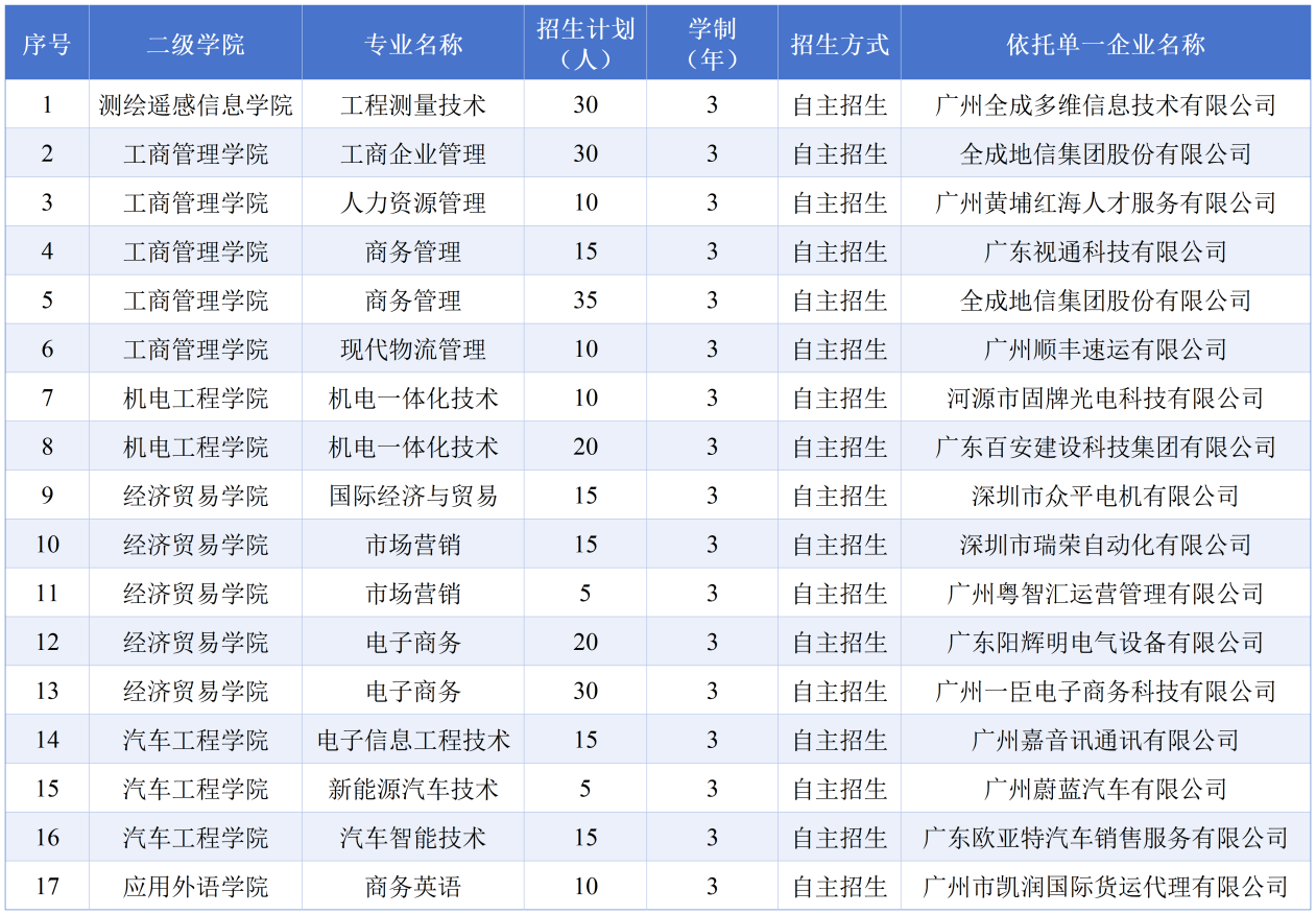 根据《广东省教育厅关于做好2026年省高职教育现代学徒制试点工作的通知》(粤教职函〔2026〕1号),我校2026年现代学徒制试点将在18个专业点招生,招生计划数共300人。其中包括:①依托单一企业开展试点共17个专业点,招生计划数290人;②依托载体开展试点共1个专业点,招生计划数10人。