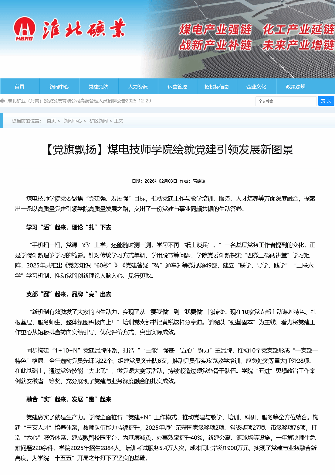 煤电技师学院党委聚焦“党建强、发展强”目标,推动党建工作与教学培训、服务、人才培养等方面深度融合,探索出一条以高质量党建引领学院高质量发展之路,交出了一份党建与事业同频共振的生动答卷。