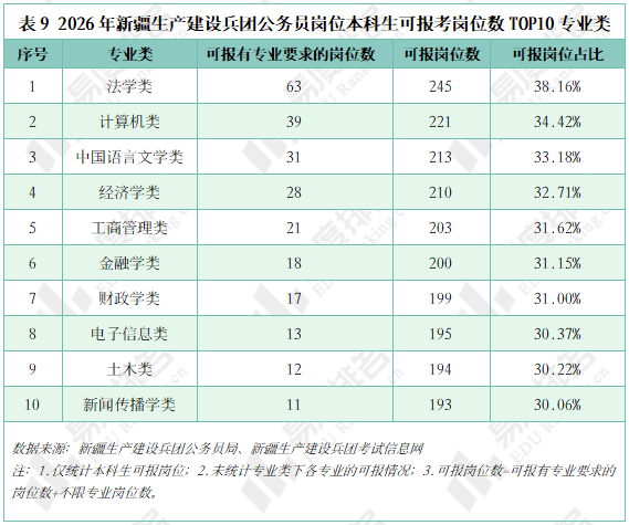 新疆生产建设兵团2026年公务员招录岗位专业要求统计显示,在本科生可报考岗位中,182个岗位未设置专业限制。专业类可报考岗位数统计结果表明,法学类专业本科学历可报考63个有专业要求的岗位,叠加不限专业岗位后,其可报考岗位占比达38.16%,居各专业类之首。计算机类、中国语言文学类紧随其后,可报考岗位占比均超33%。从专业类前十来看,政法、经管、文学相关专业在公务员招录中仍保持优势地位,理工科中,计算机类、电子信息类、土木类专业亦表现突出,可报考岗位数量可观。