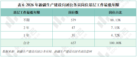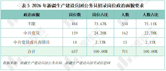 新疆生产建设兵团公务员招录岗位中,要求中共党员的比例明显高于其他各省,2026年达到24.20%,另有2.13%岗位要求中共党员或共青团员。不限政治面貌的岗位占比为73.67%。