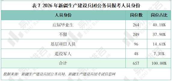 2026年新疆生产建设兵团公务员招录岗位对报考人员身份作出了细致划分:40.18%岗位要求报考人员为应届毕业生,叠加不限身份岗位(占比37.90%)后,应届毕业生可报告岗位占比显著。此外,14.61%岗位仅限基层项目人员报考,7.31%岗位仅限退役军人报考。