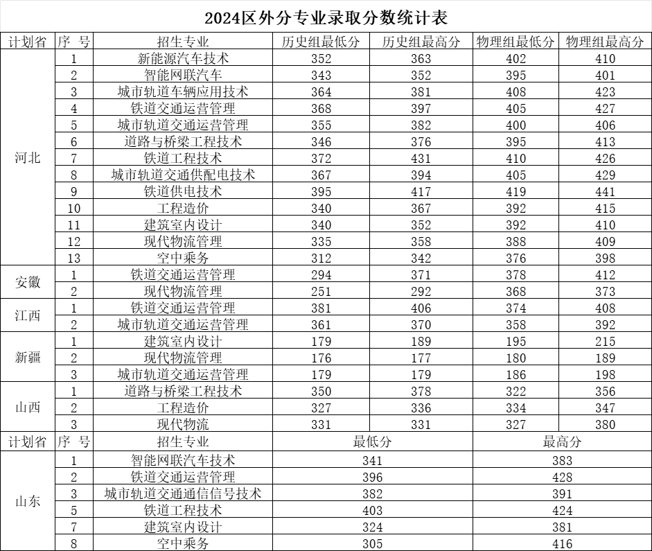 内蒙古交通职业技术学院2024年区外分专业录取分数统计表