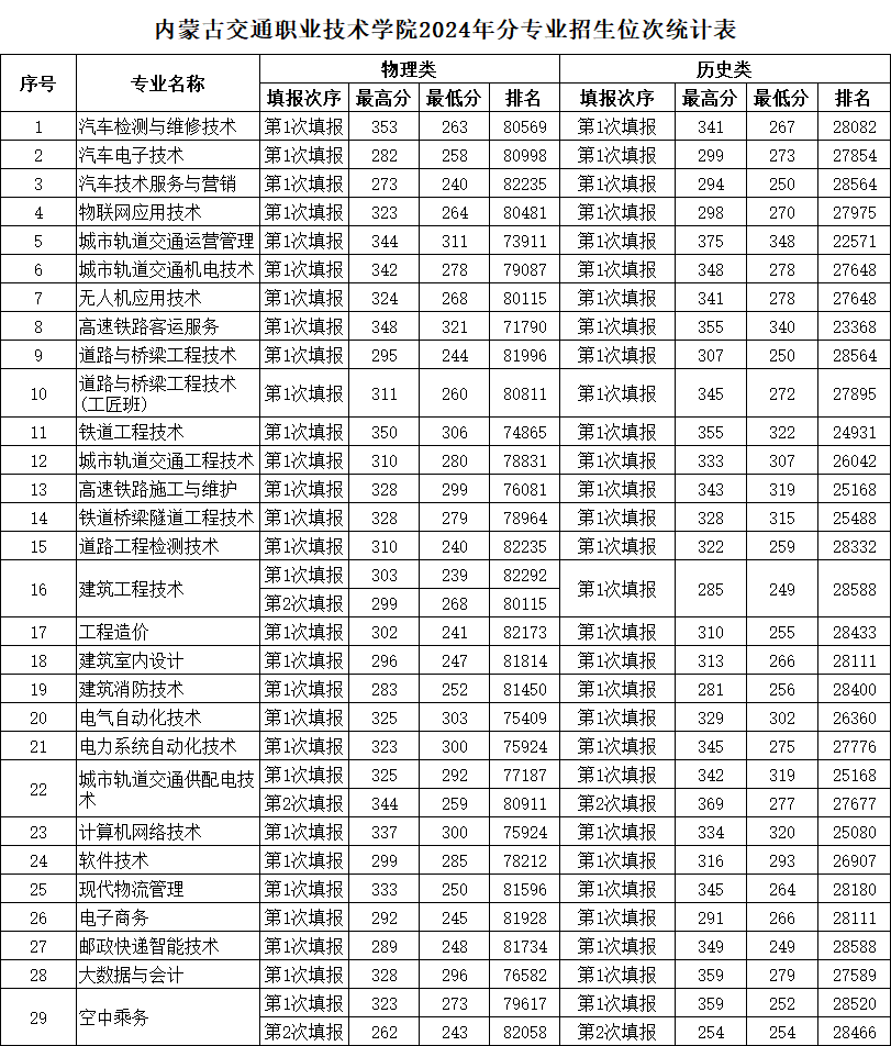 内蒙古交通职业技术学院2024年区内分专业招生位次统计表