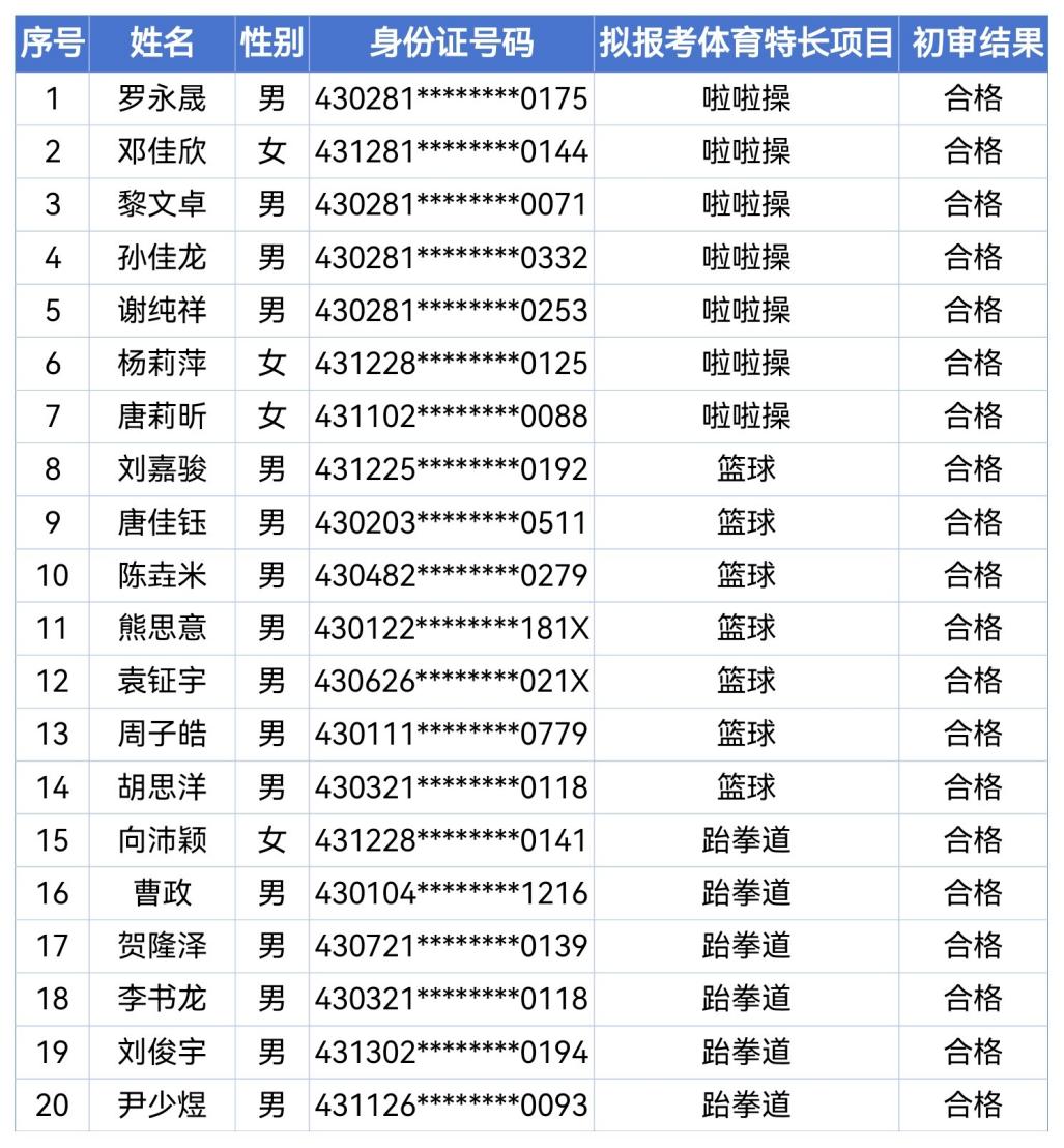 根据《湖南省教育厅关于做好湖南省2026年高职(高专)院校单独招生工作的通知》(湘教发〔2026〕1号)、湖南省教育考试院《关于做好我省2026年高职院校单独招生工作具体事项的通知》(湘教考通〔2026〕1号)要求,以及学校2026单独招生章程规定,学校对拟报考我校的C类体育特长生考生提交的资格材料进行了审核,现将审核结果公示如下,公示期5天。如有异议,请于2026年2月11日17:00前向学校反馈。