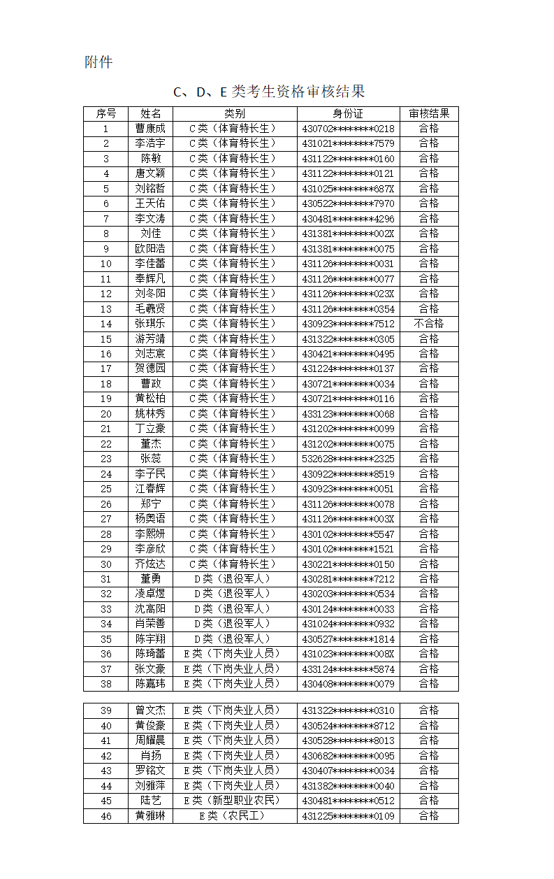 根据《湖南省教育厅关于做好湖南省2026年高职(高专)院校单独招生工作的通知》(湘教发〔2026〕1号)、湖南省教育考试院《关于做好我省2026年高职院校单独招生工作具体事项的通知》(湘教考通〔2026〕1号)要求,以及学校2026单独招生章程规定,学校招生就业处、公共课部、纪检监察处对拟报考我校的C、D、E类考生提交的资格材料进行了审核,现将审核结果公示如下(详见附件)。如有异议,请于2026年2月11日12:00前向学校招生就业处反馈。联系电话:0731--84099000,0731--84099018。