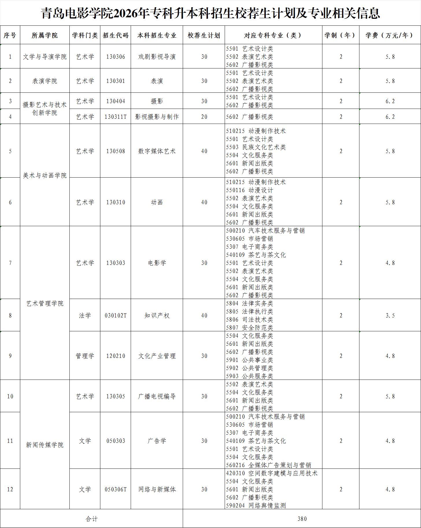 (一)青岛电影学院 2026年专科升本科招生专业相关信息