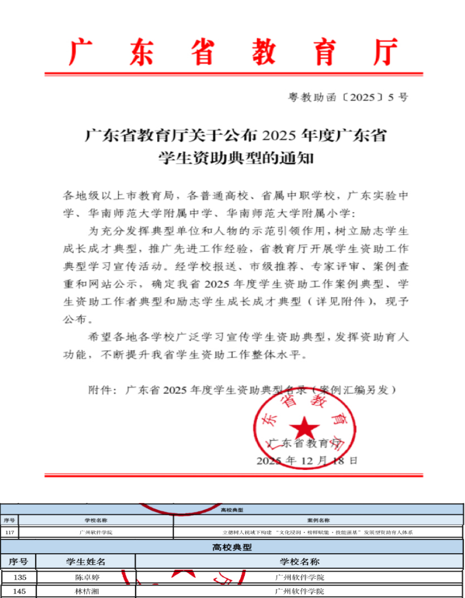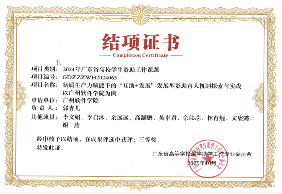 这一年,我校工作案例《立德树人视域下构建“文化浸润·榜样赋能·技能强基”发展型资助育人体系》获评“广东省2025学生资助工作案例典型”;2名同学荣获“励志学生成长成才典型”称号;1名老师获评广东省高校学生资助先进工作者;2名老师获评广东省2025年资助下乡优秀指导老师,2名学生获评优秀实践队员;2024年广东省高校学生资助工作课题一等奖1项,三等奖1项。