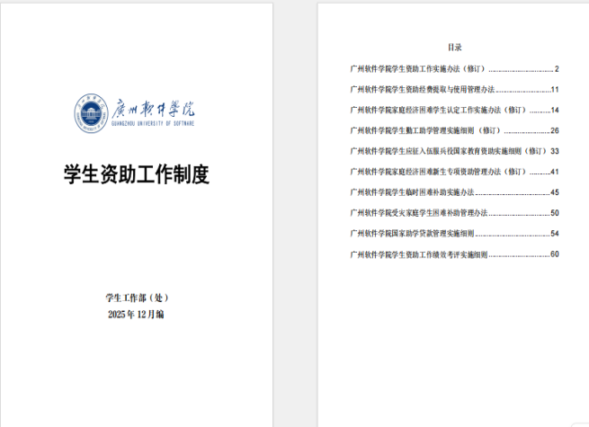 以政策为基石,健全资助制度体系。修订《广州软件学院学生资助政策简介》等多项学生资助工作制度,汇编成册并印刷寄送至每一位新生手中,学生资助工作制度化、规范化建设更加坚实。