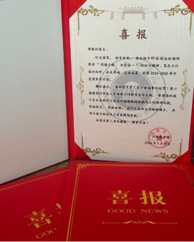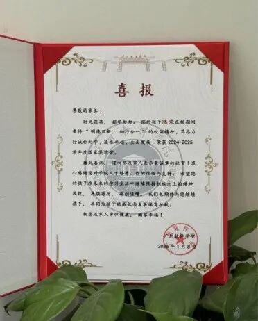 学校精心制作满载荣誉的喜报,郑重寄送至获得国家奖学金学子家中。这一纸喜报,不仅是学业成就的褒扬,更是将国家级的认可转化为家庭共享的荣光。它超越了简单的通知,成为连接校园与家庭的情感纽带,彰显了“家校共育”的核心价值,激发学子持续奋进的动力,共同谱写以表彰促成长的育人乐章。