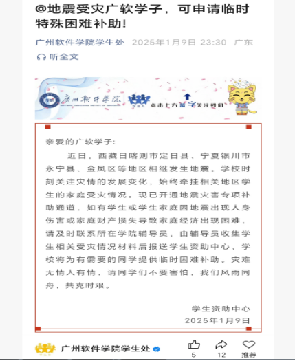 每当全国各地区遭受暴雨、洪涝、地震等自然灾害时,学校总在第一时间启动受灾学生情况排查,为有需要的学生畅通临时救助通道,全年为27名因灾、因病导致家庭困难的学生提供临时困难补助,全力保障学生在校安心学习、生活。