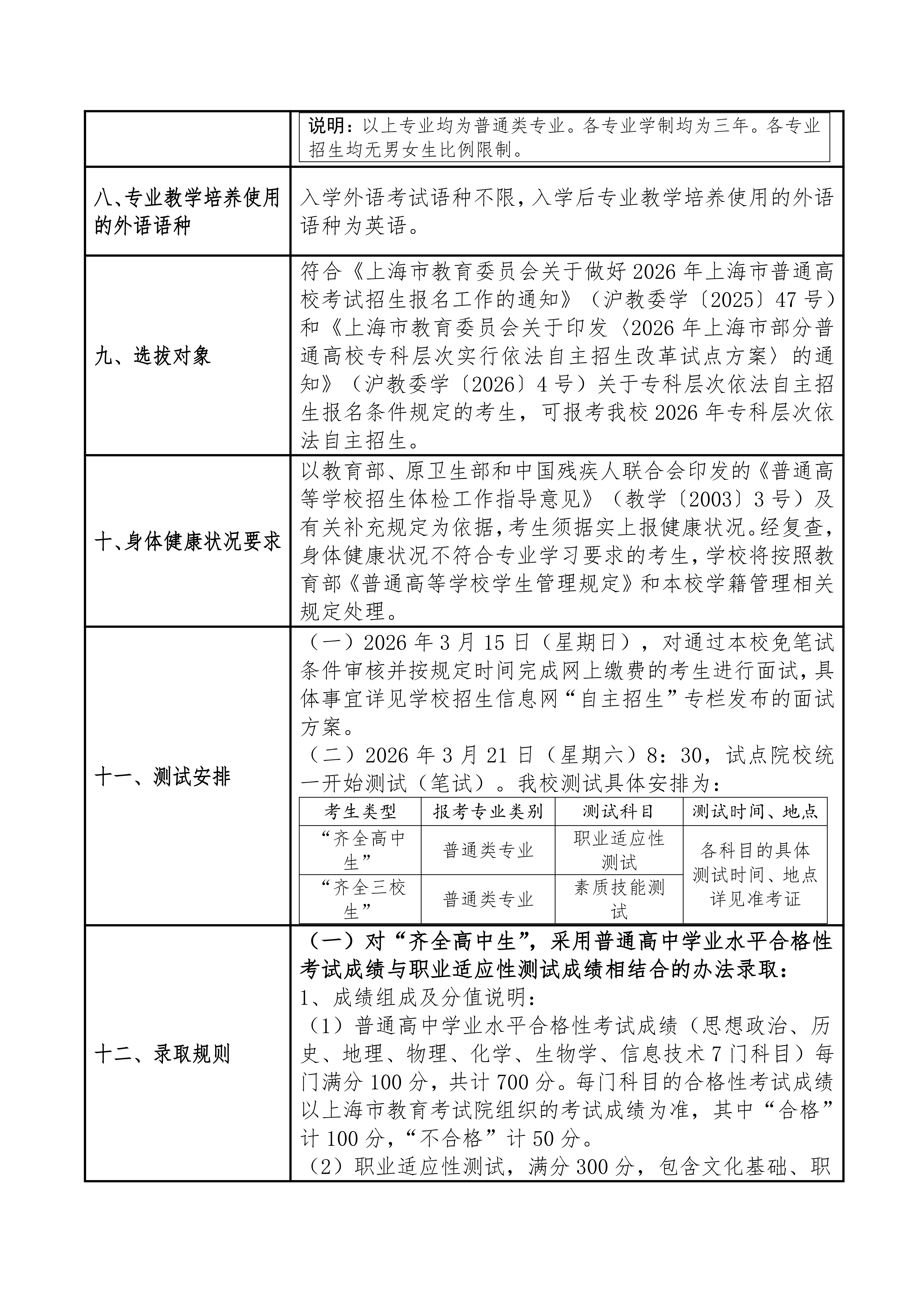上海浦东职业技术学院2026年专科层次依法自主招生章程