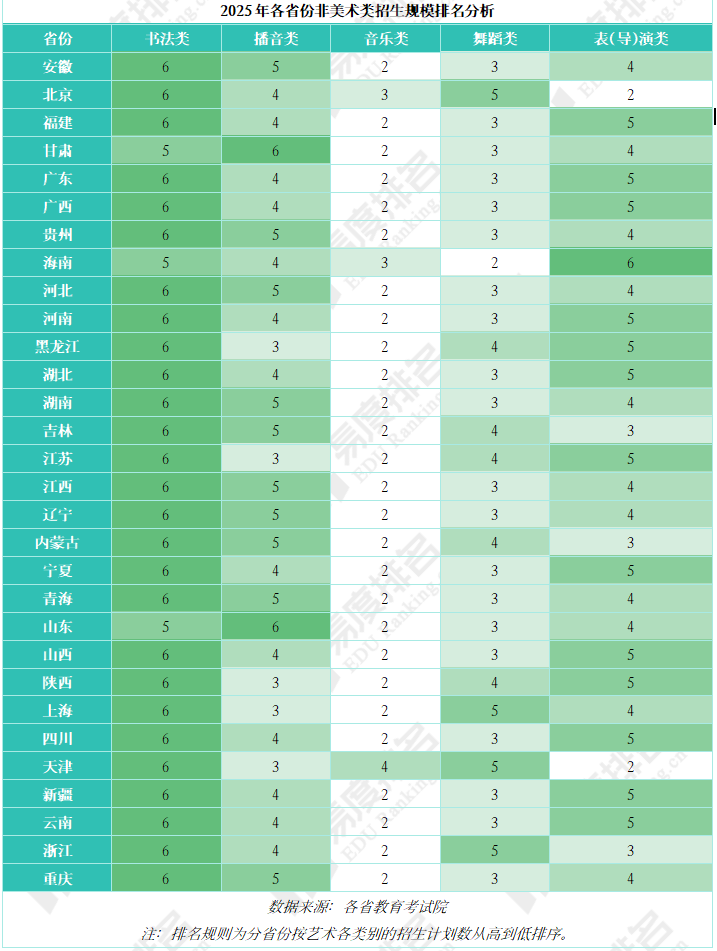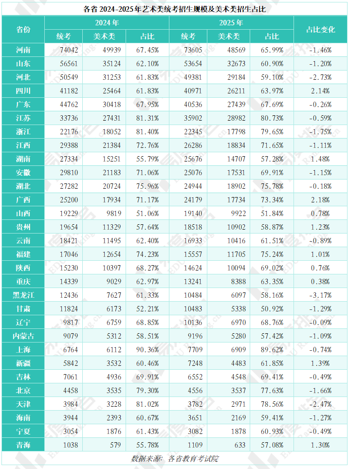 河南、山东、河北在2024-2025年的艺术类统考招生规模上持续位列前三,充分彰显了其作为高考大省的领先地位。