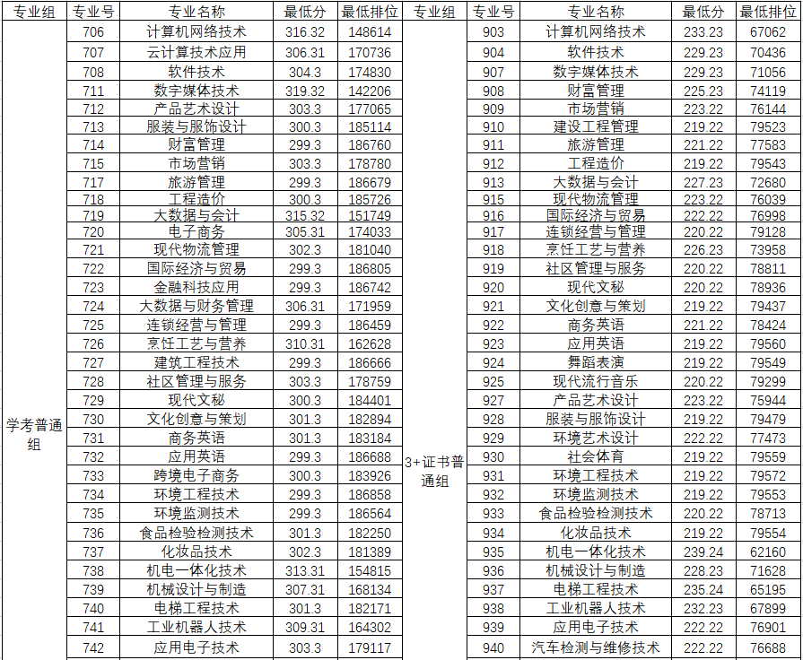 附:汕头职业技术学院2025年春季高考各专业最低录取分数和最低排位