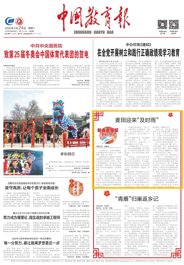 2月24日,《中国教育报》在马年首期头版重要位置,刊发题为《麦田迎来“及时雨”》的文章,深度报道我校专家寒假期间顶风冒寒,扎根小麦产区生产一线,抢抓农时指导麦田管理的生动实践。这不仅是麦田里的一堂“大课”,更是山东农业大学在创建一流农业大学的道路上,勇担使命、服务国家战略、回应时代需求的坚实行动!