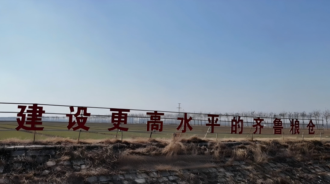 “你看,这就是我们的目标。”顺着陈建省所指的方向,记者看到,在小麦田边,漆着的红字格外显眼——建设更高水平的“齐鲁粮仓”。