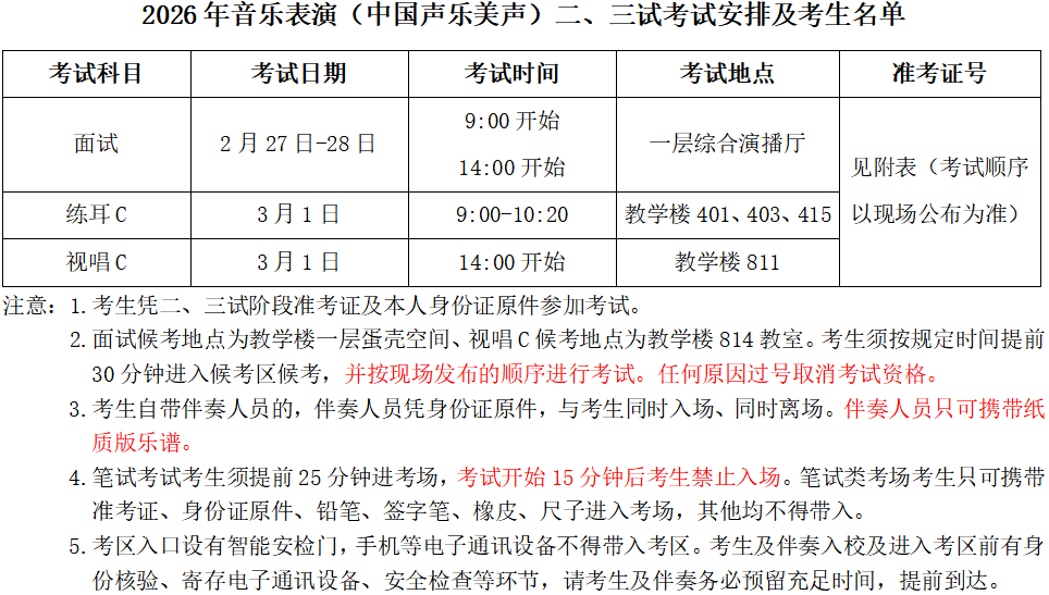 音乐表演(中国声乐美声)面试02月27日上午1层综合演播厅 音乐表演(中国声乐美声)面试02月27日下午1层综合演播厅 音乐表演(中国声乐美声)面试02月28日上午1层综合演播厅 音乐表演(中国声乐美声)面试02月28日下午1层综合演播厅 音乐表演(中国声乐美声)练耳C03月01日上午401教室 音乐表演(中国声乐美声)练耳C03月01日上午403教室 音乐表演(中国声乐美声)练耳C03月01日上午415教室 音乐表演(中国声乐美声)视唱C03月01日下午811教室