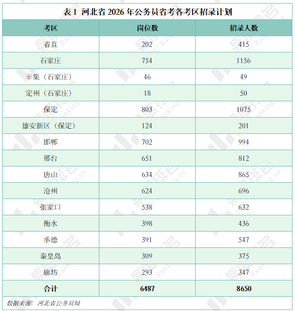 2026年河北省公务员省统考共计划有6487个岗位,计划招录8650人。其中省直机关计划招录415人。各地市招录公务员,省会石家庄市共计划招录1255人,其中石家庄市辛集市、石家庄市定州市单独设置考区,分别计划招录49人、50人。