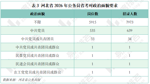 下表展示了2026年河北省考公务员招录对政治面貌的要求情况。其中有535个岗位要求政治面貌为中共党员,有33个岗位要求中共党员或共青团员,1个岗位要求中共党员或共青团员或群众。91%以上的岗位不限政治面貌,不限政治面貌岗位为各类人才提供了平等的竞争机会,在一定程度上体现了公务员招录的公平性。