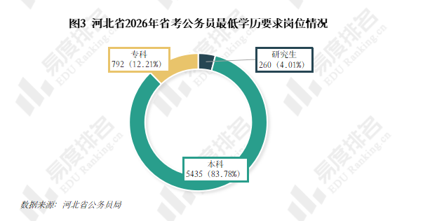 河北省2026年省考公务员招录,本科毕业生是绝对的主力,从统计数据来看,95%以上的招考岗位本科生都可以报考,4.01%的岗位对学历的最低要求为研究生。