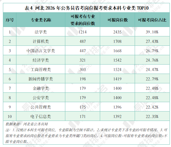 表4统计了河北省2026年公务员省考可报考岗位TOP10的专业类,本次公务员招录有6227个岗位本科生可以报考,其中有1221个岗位不限专业。