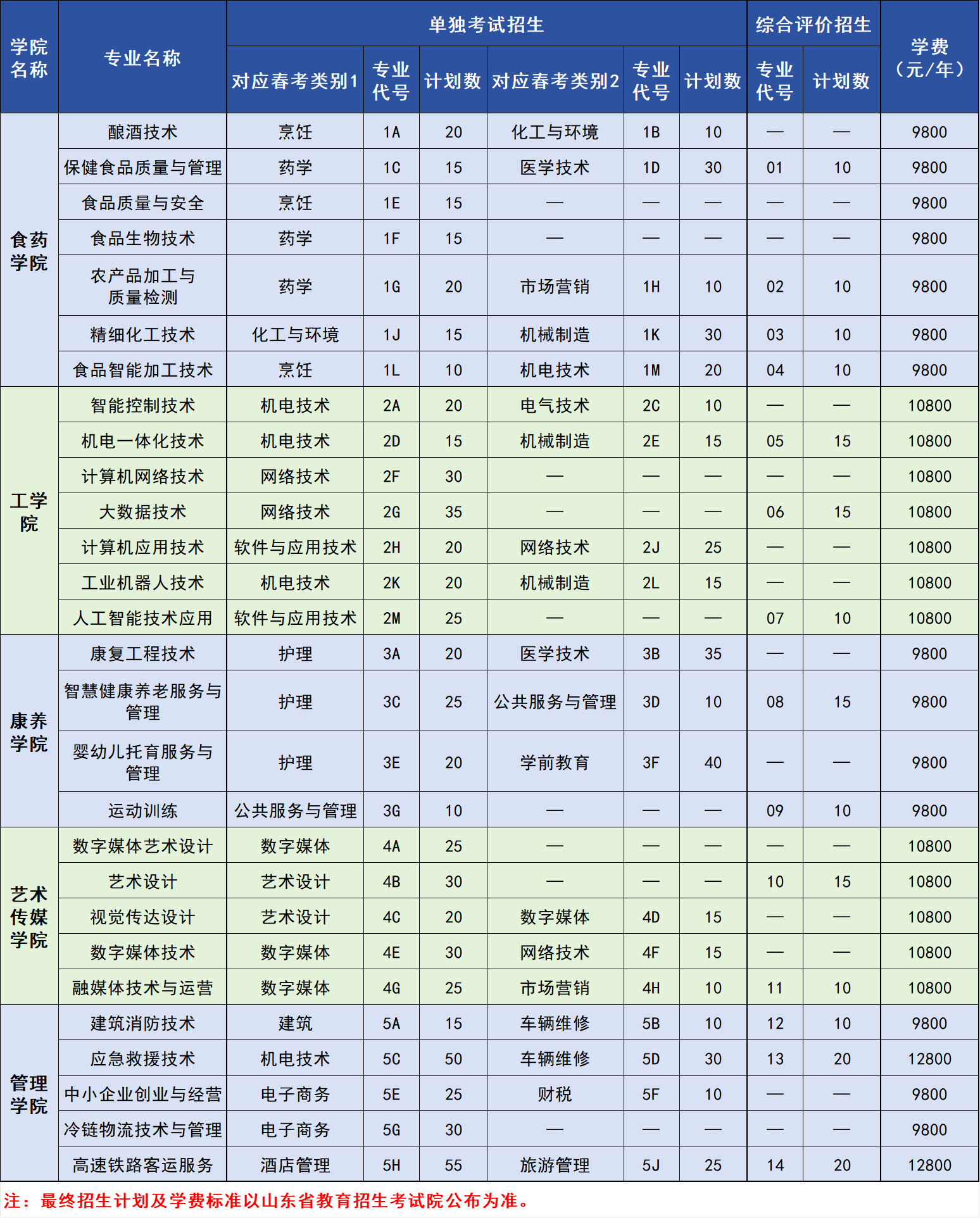 潍坊食品科技职业学院2026年单招综评招生计划
