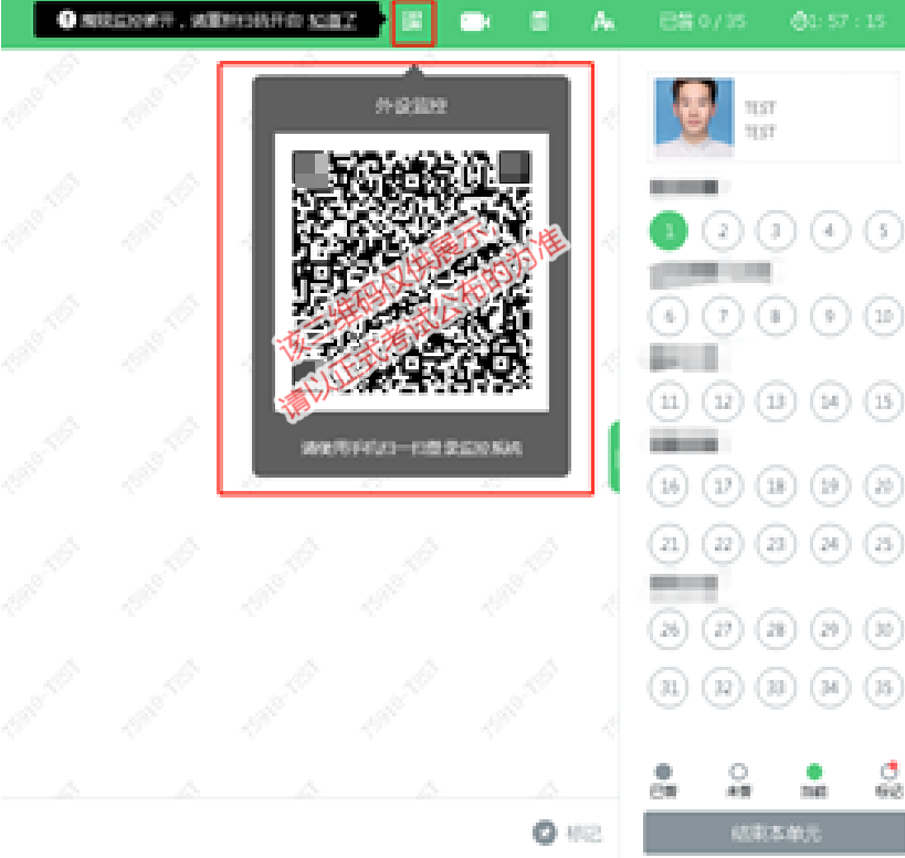 (1)进入考试后,考试设备上会显示云监考(鹰眼)监控二维码,使用智能手机或平板设备扫描二维码(如下图所示);注:以下呈现的所有二维码仅供展示,请以实际考试中获取的二维码为准。